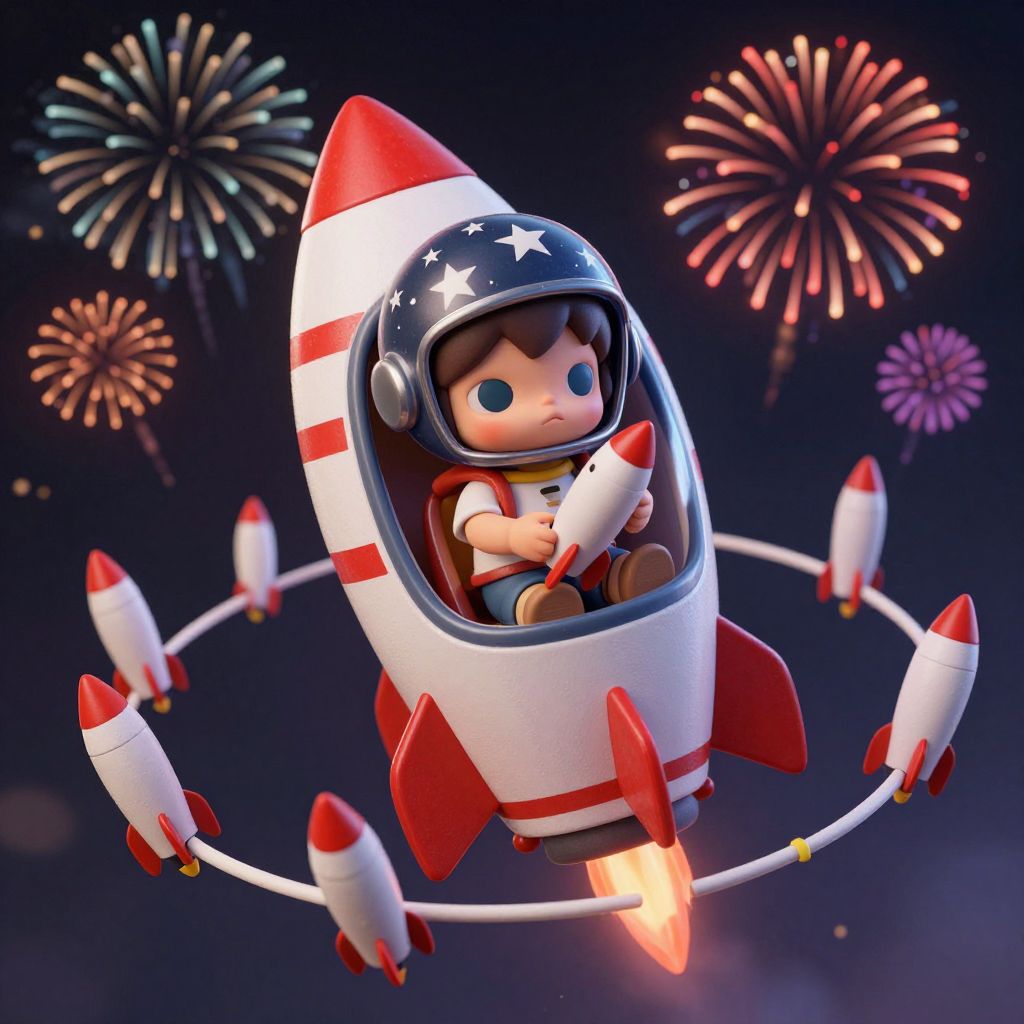 A vibrant digital illustration of a chibi-style child with large blue eyes, wearing a red and white striped astronaut suit, and a star-spangled helmet, riding a red and white rocket. The child holds a smaller red and white rocket with a glowing orange engine. The background features colorful, glowing fireworks against a dark blue night sky. The rocket has additional smaller rockets attached to its circular frame. The image has a playful, cartoonish style with a focus on bright, bold colors and a whimsical, festive atmosphere.