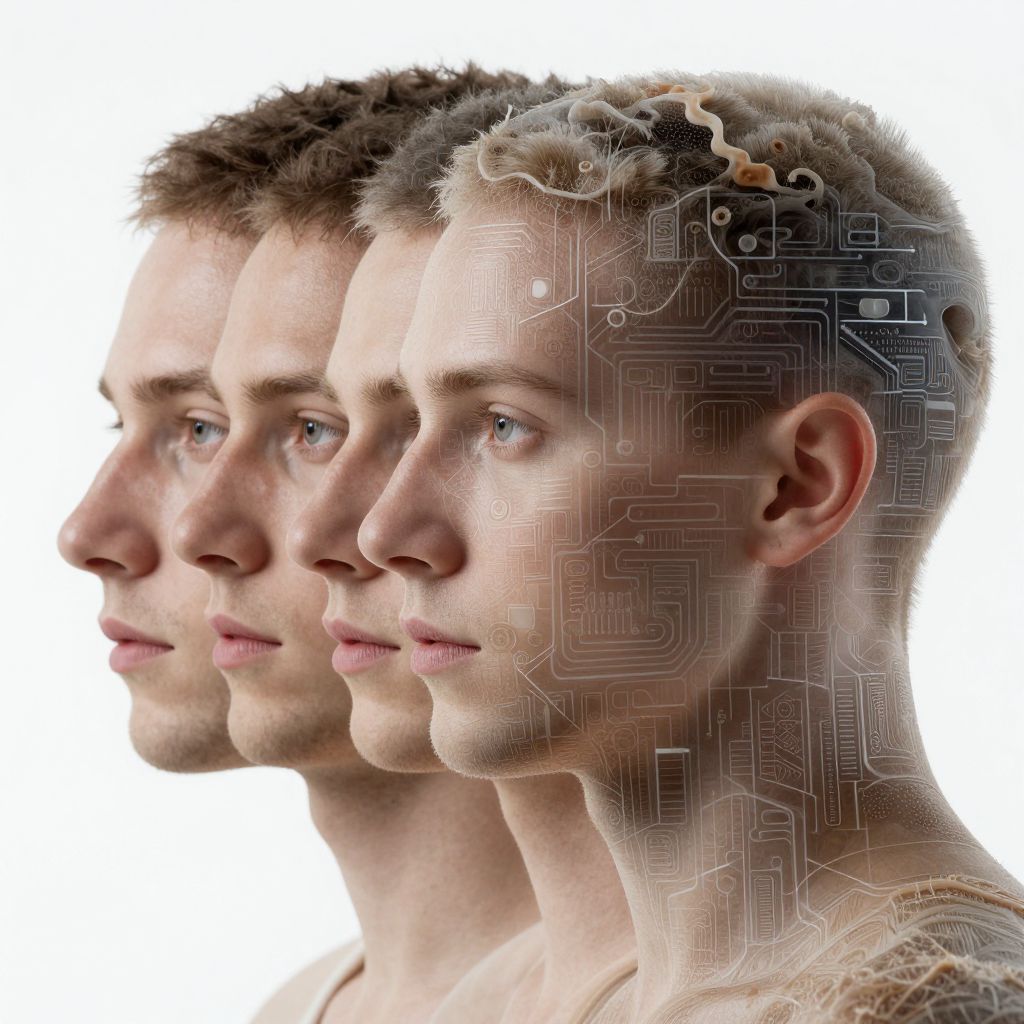 A surreal representation of iteration featuring a series of overlapping transparent human faces evolving in complexity, blending organic textures with circuit patterns, illustrating the process of repeated enhancements and learning.