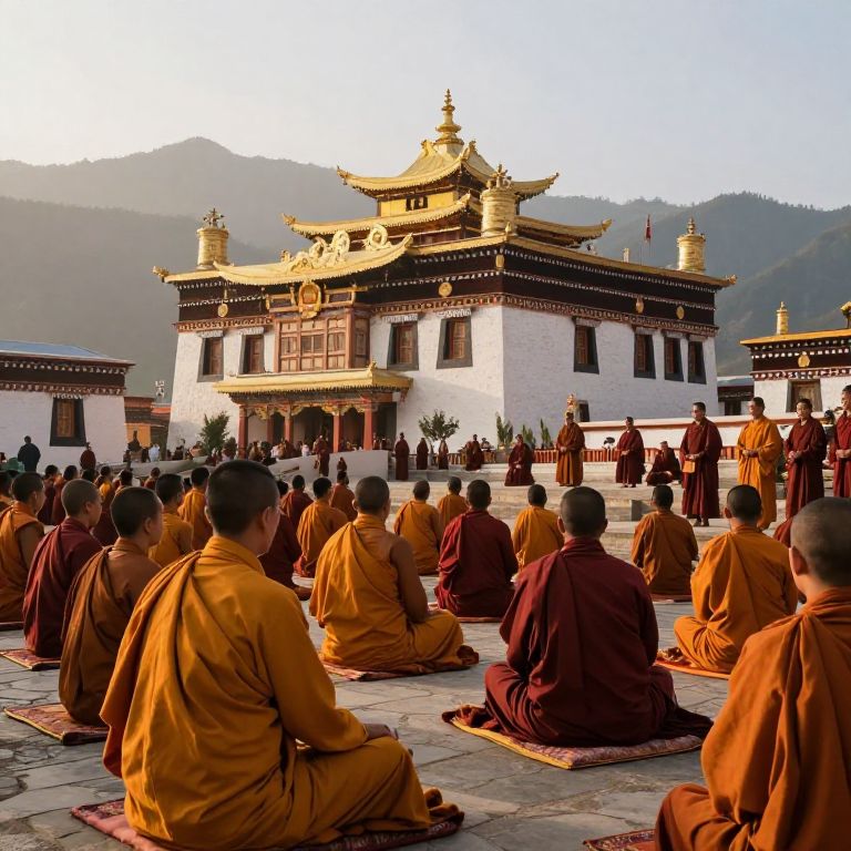 Photograph of a Tibetan monastery with white walls and gold-trimmed roof. Dozens of Buddhist monks, wearing saffron and maroon robes, sit cross-legged on patterned mats in the courtyard. The monks face a central building with traditional Tibetan architecture. In the background, mountains rise under a clear blue sky. The courtyard is paved with stone tiles, and potted plants are near the building's entrance. The monks' robes contrast with the white and gold of the building, creating a vibrant and serene scene.