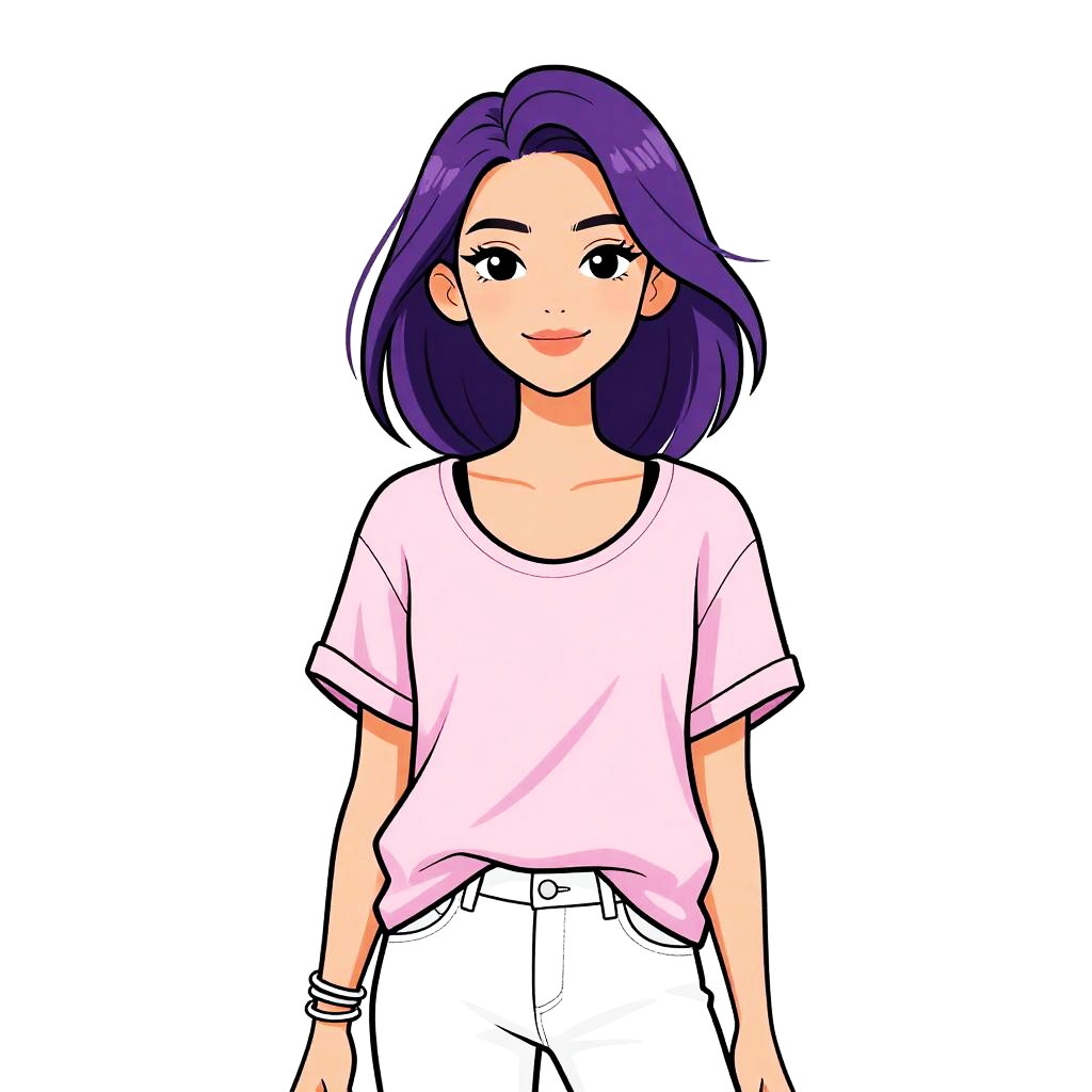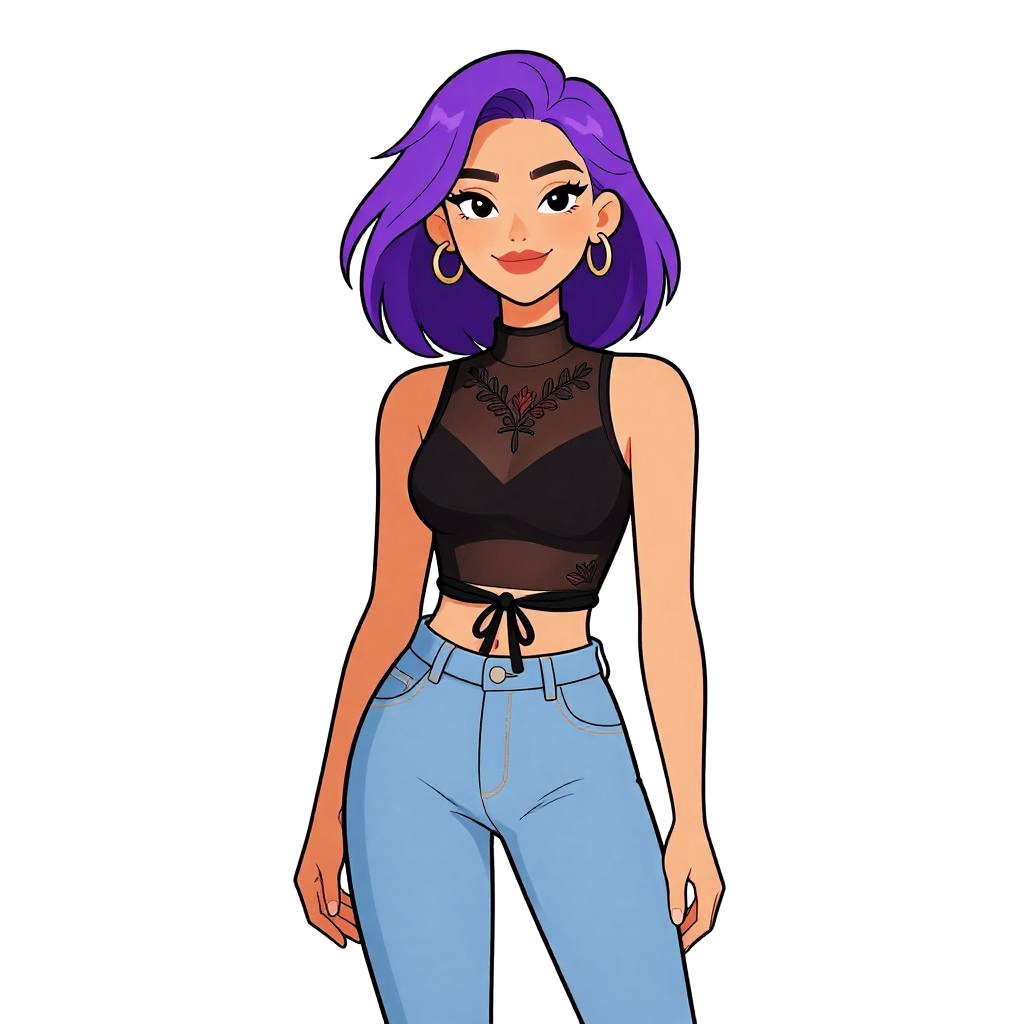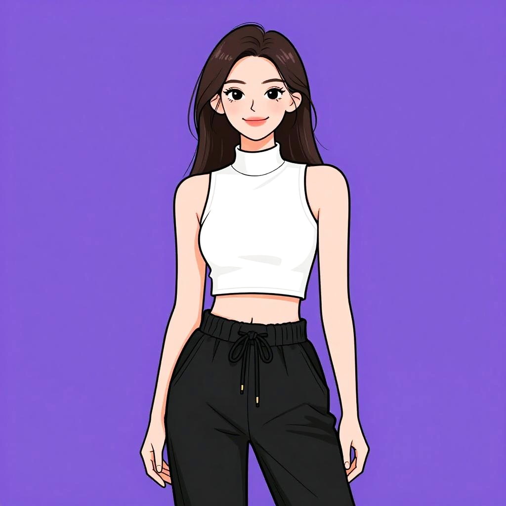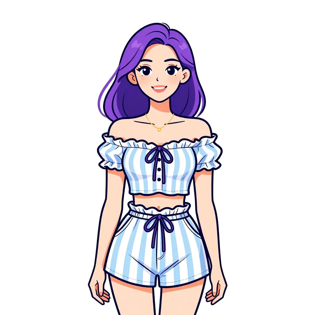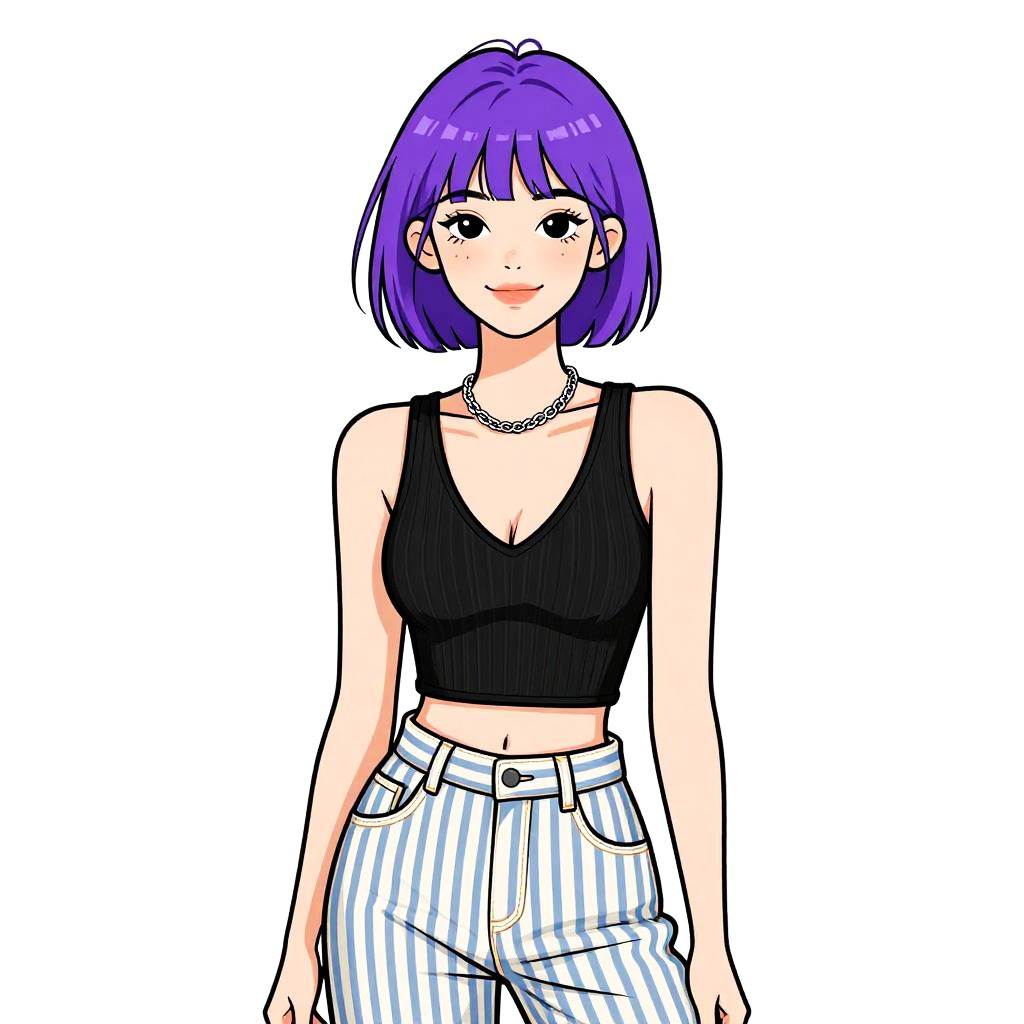 Woman with pretty face and pretty hair. smiling Woman, contemporary casual, black ribbed crop top, deep V-neckline, sleeveless, striped high-waisted trousers in blue and white, casual fit, silver chain necklace, light makeup, straight bangs, hair in a casual updo, white studio background --sref 1461