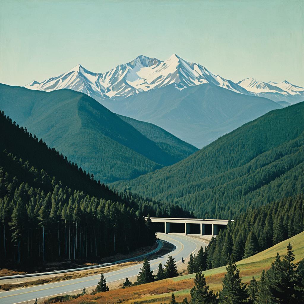 Cyberpunk picture a view of a forest with majestic mountains in the distance. In the style of Richard Diebenkorn, create a painting that captures organic curves intertwining with angular mountain formations. Use a limited color palette of muted greens, blues, and browns.