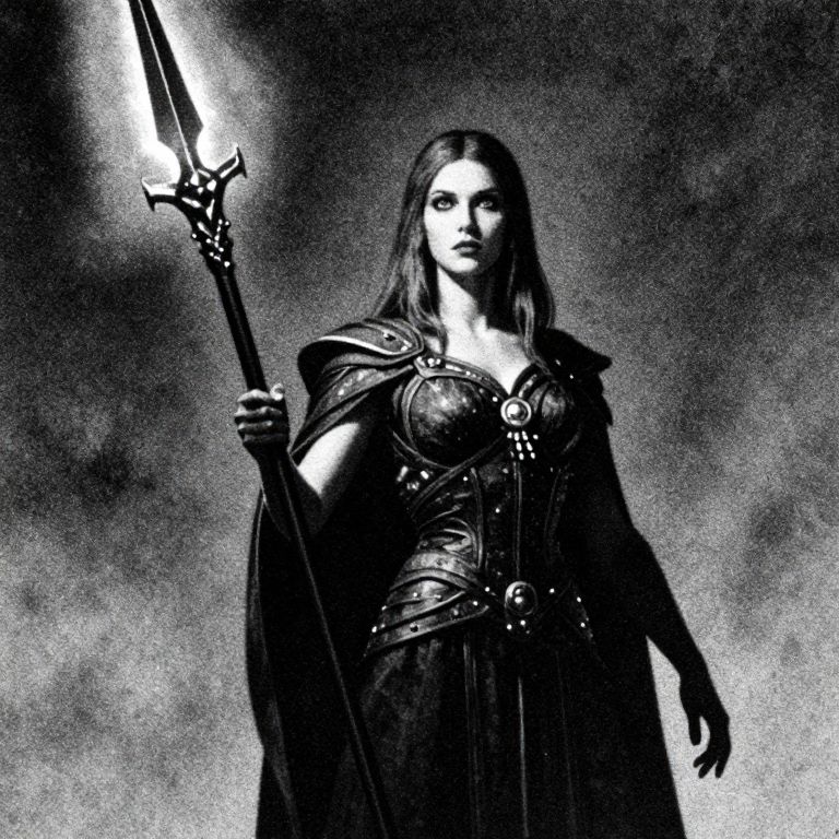 DNdGr41nyB0yz style, Dark fantasy illustration of a celestial maiden wielding a Large dark glowing spear, grainy, noise, 1970s dark cyberpunk book cover paper art dungeons and dragons style drawing