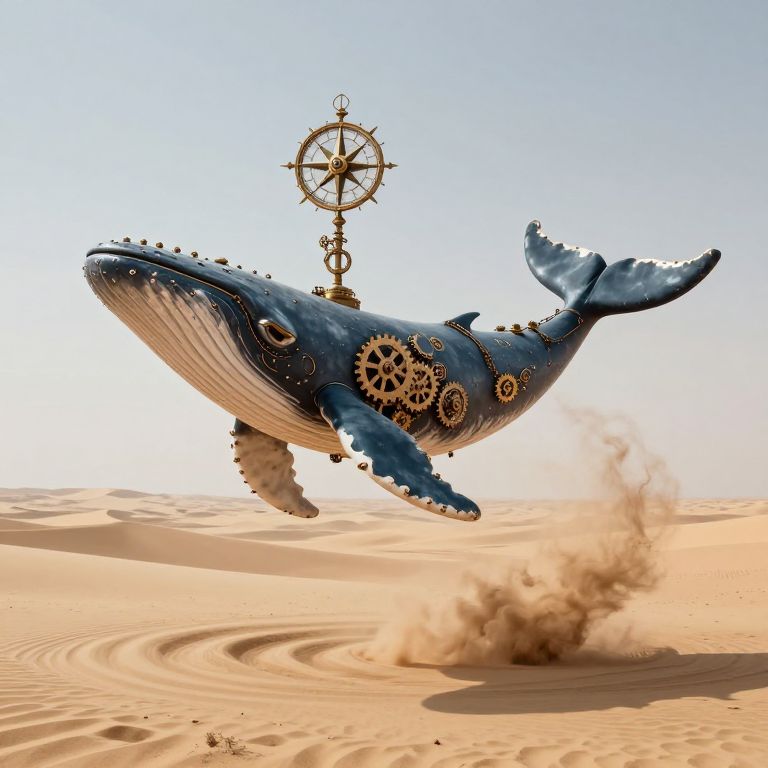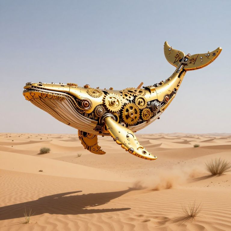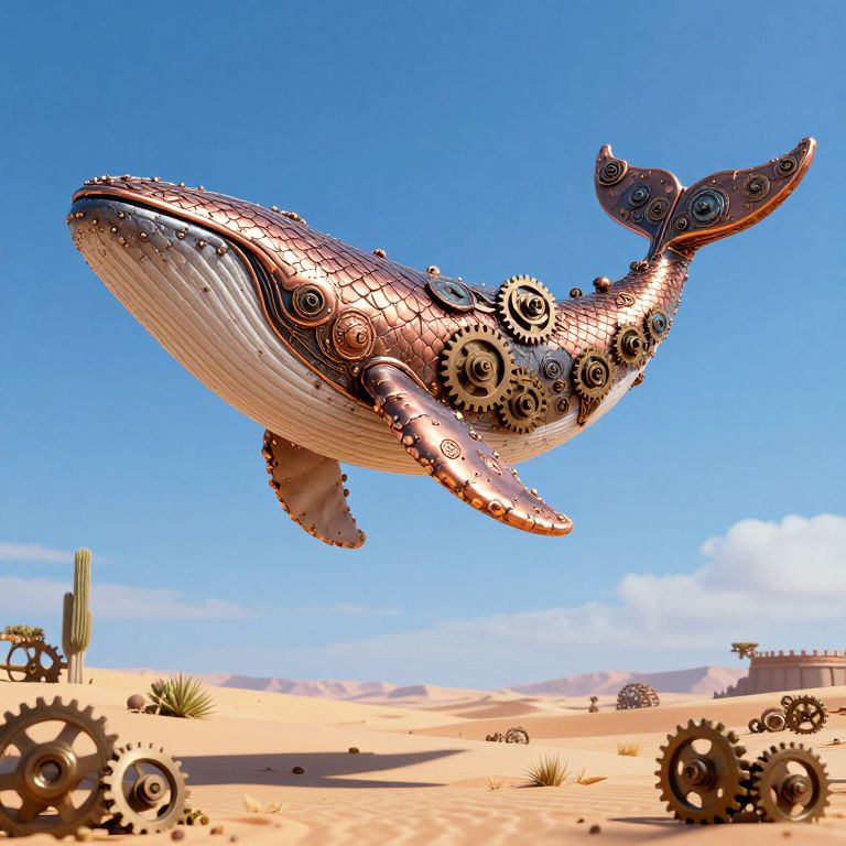 A steampunk-inspired 3D render depicts a mechanical whale hovering above a desolate desert landscape, its body adorned with intricate gears and a central clock face, as it emits a swirling column of sand beneath its tail, evoking a surreal blend of fantasy and industrial aesthetics.
