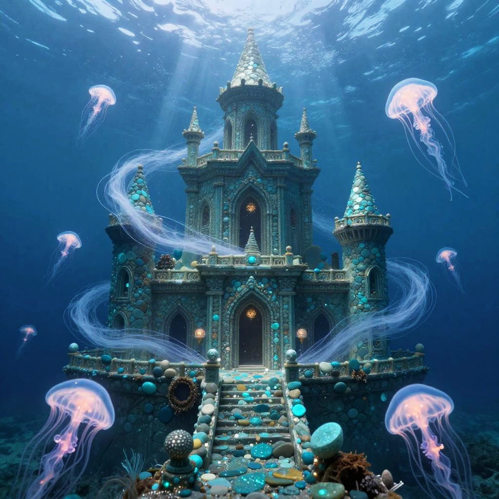 Underwater castles built from shimmering turquoise stones, wrapped in swirling currents and glowing jellyfish, ethereal and magical setting with soft beams of light penetrating deep blue ocean, fantasy illustration