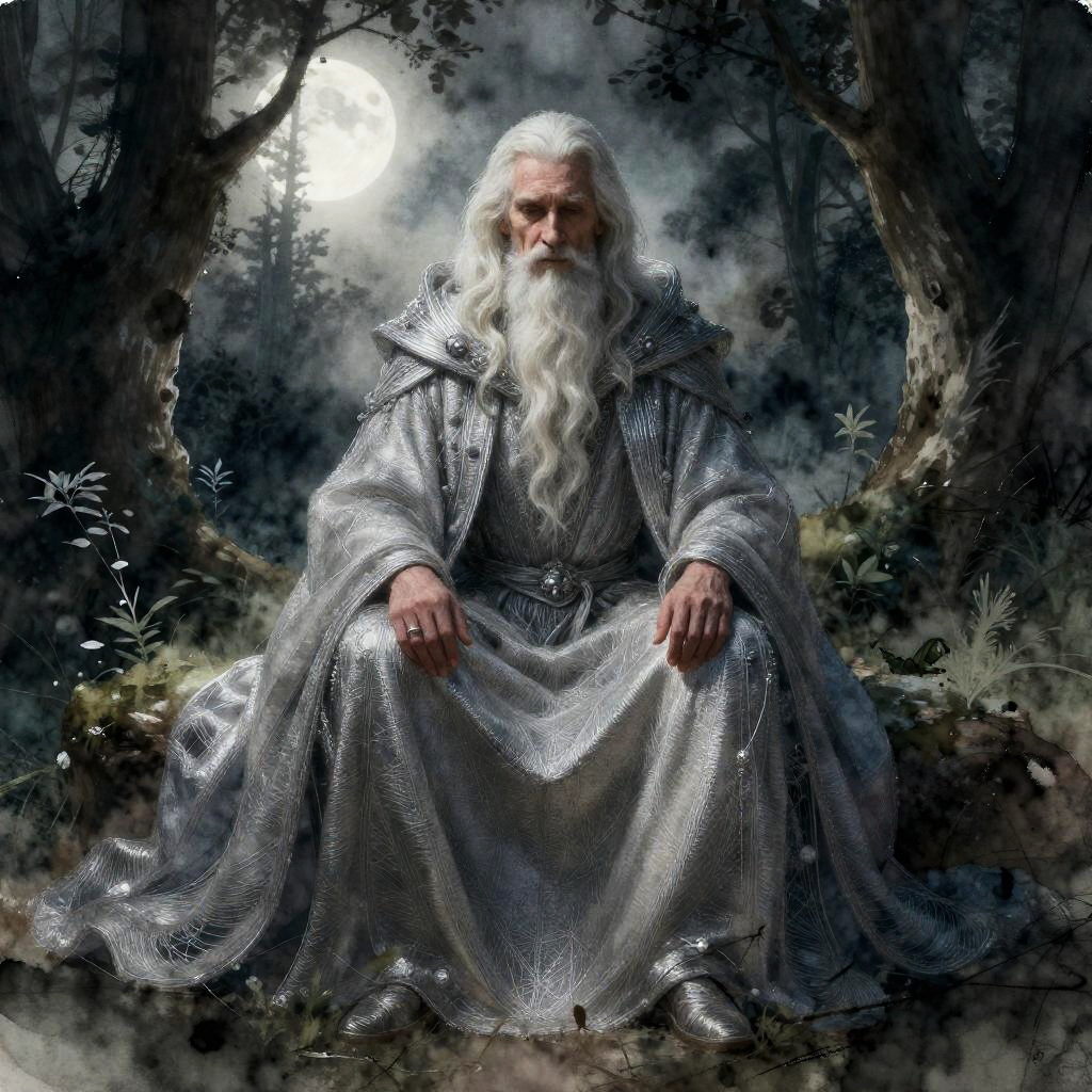 Realistic photo.a mysterious old man in a flowing cloak made of silver threads sits in a moonlit grove, with the cloak covering almost the entire area. Rendered in delicate tones and fantasy art style, the composition emphasizes depth and scale, with atmospheric, volumetric watercolor and ink effects. Soft airbrushing adds a hyperrealistic touch, blending dark botanical elements with light haze to create an aesthetic atmosphere filled with beauty, sensuality, and emotion. realistic photo