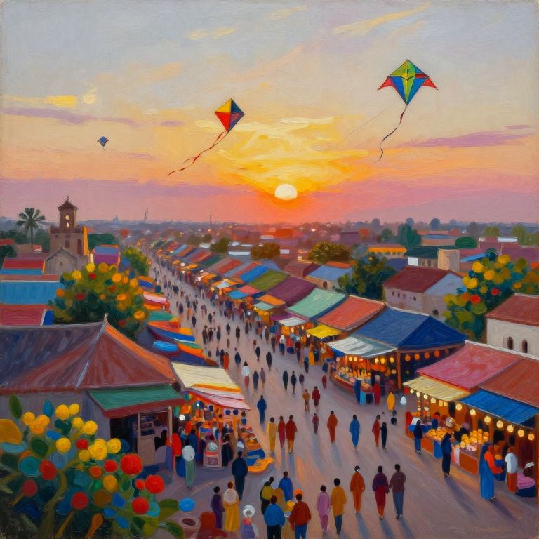 An oil painting capturing the essence of a bustling marketplace at twilight from an aerial viewpoint, with colorful kites adorning the sky as the sun sets. The warm glow illuminates the lively scene, showcasing a vibrant fusion of local architecture and flora through swirling, expressive brushstrokes that evoke both joy and nostalgia. This unique perspective invites viewers to immerse themselves in this whimsical and dreamlike setting, where diverse cultures harmoniously coalesce into a mesmerizing tapestry of colors and forms.
