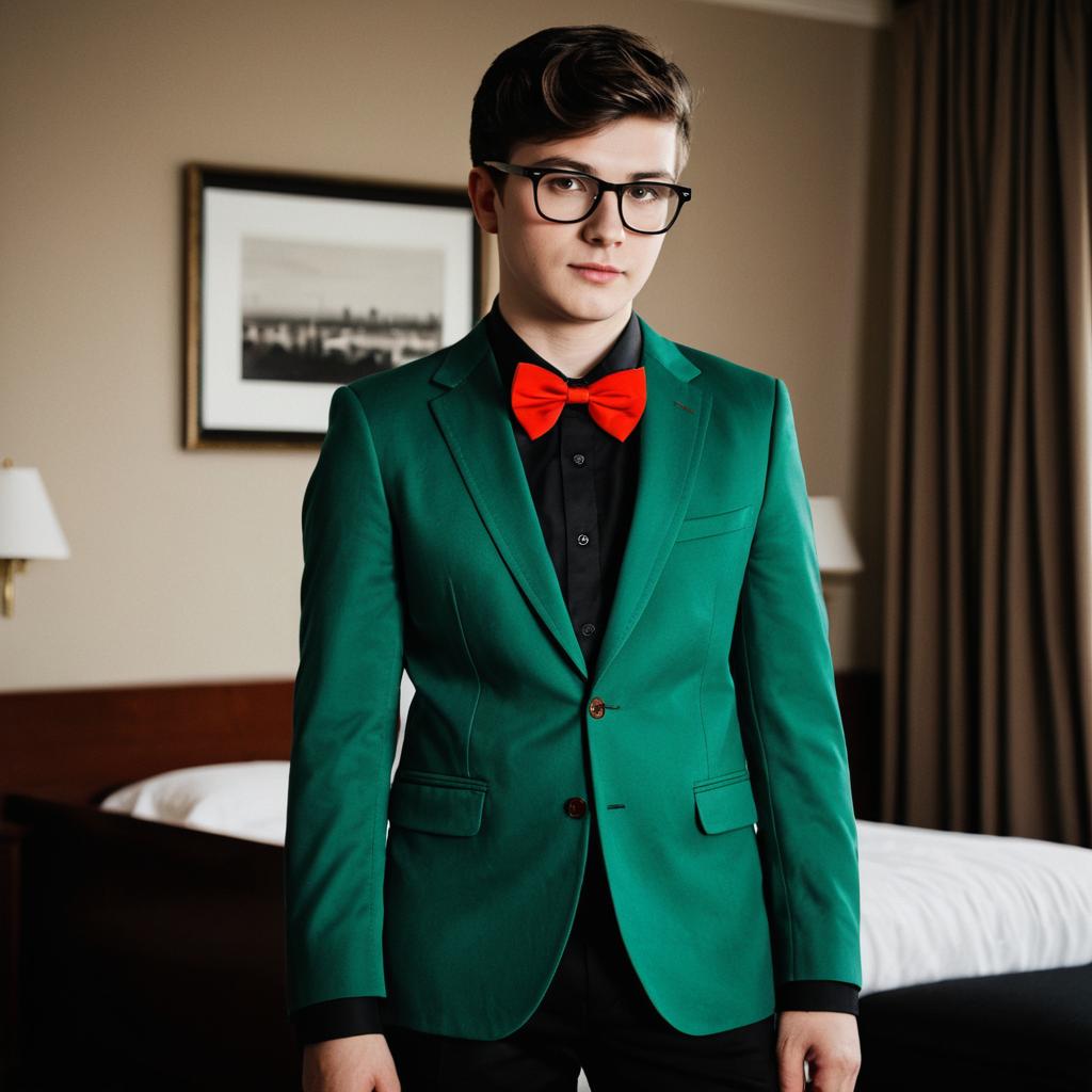 Portrait of a young man with brown hair and glasses wearing a green suit jacket, black collared shirt, red bow tie, and black pants. He is standing indoors in a room with a bed and framed picture in the background. The setting appears to be a bedroom or hotel room.