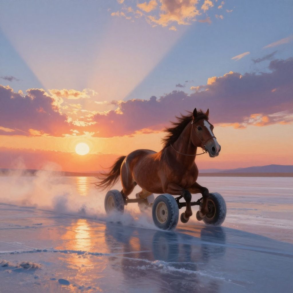 Photograph of a muscular brown horse with a white stripe, trotting on four large wheels across a frozen, reflective lake at sunset, with vibrant orange