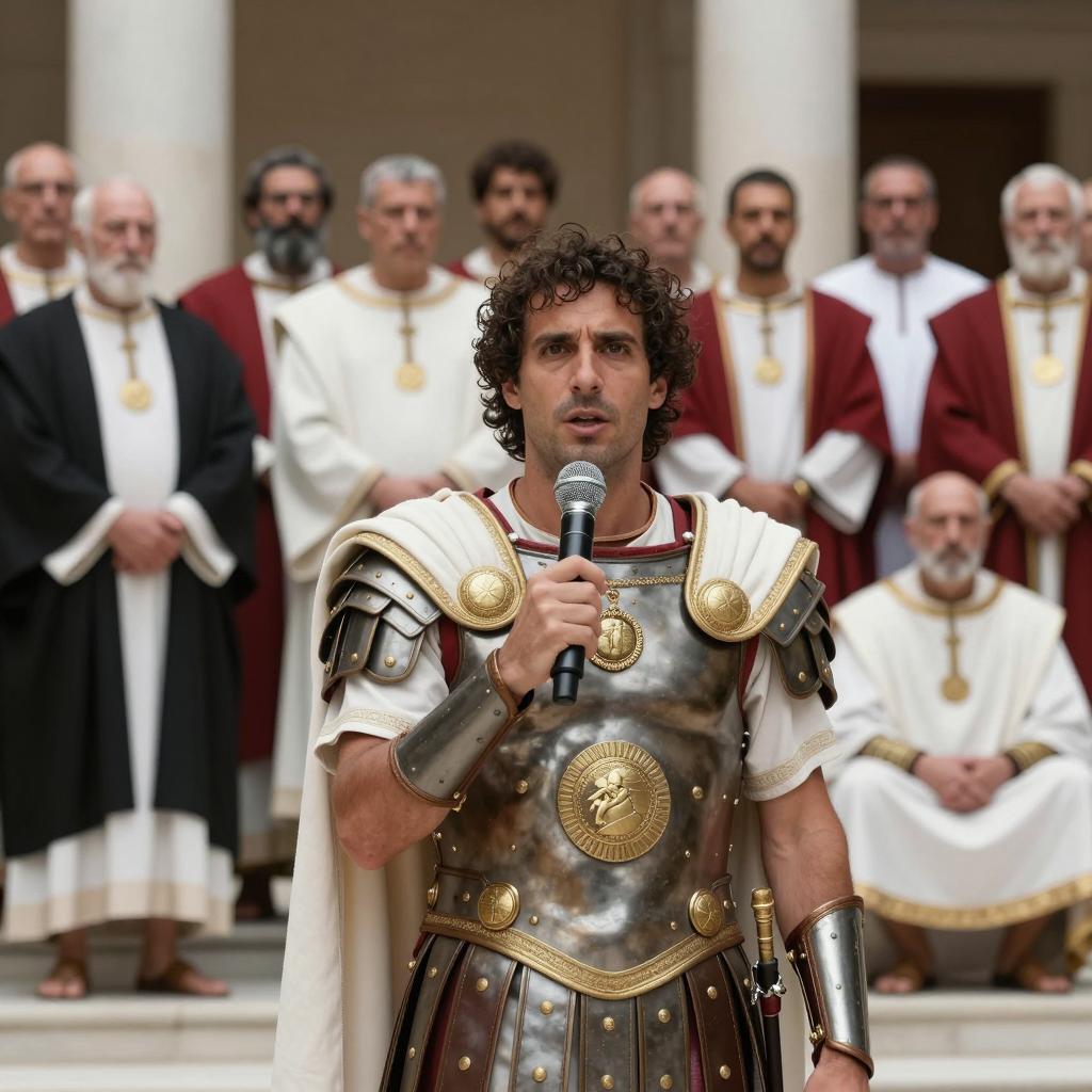 Photograph of a group of men in a dimly lit room. Three men in the foreground wear ancient Roman-style armor, one with a golden helmet, one with a black helmet, and one with a white toga wrapped around his body. The man in the center has dark hair, a muscular build, and a serious expression. Background includes 14 men in various ancient and modern clothes, standing in a semi-circle. Warm lighting highlights the central trio.