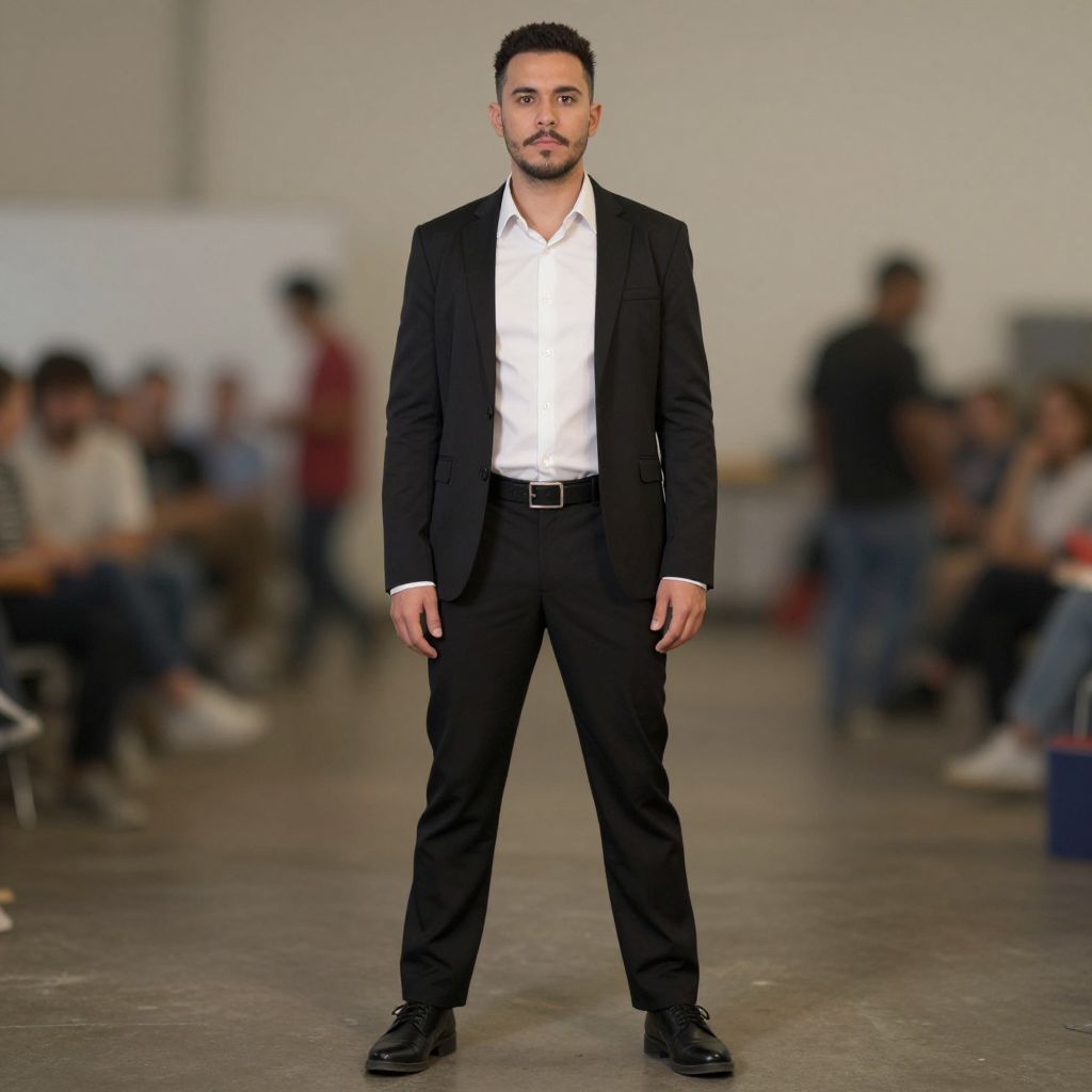 Disco costume man, male focus, 1boy, pants, belt, facial hair, jacket, standing, shirt, black footwear, full body, blurry, solo focus, realistic, long sleeves, shoes, indoors, mustache, looking at viewer, photo background, blurry background, collared shirt, short hair