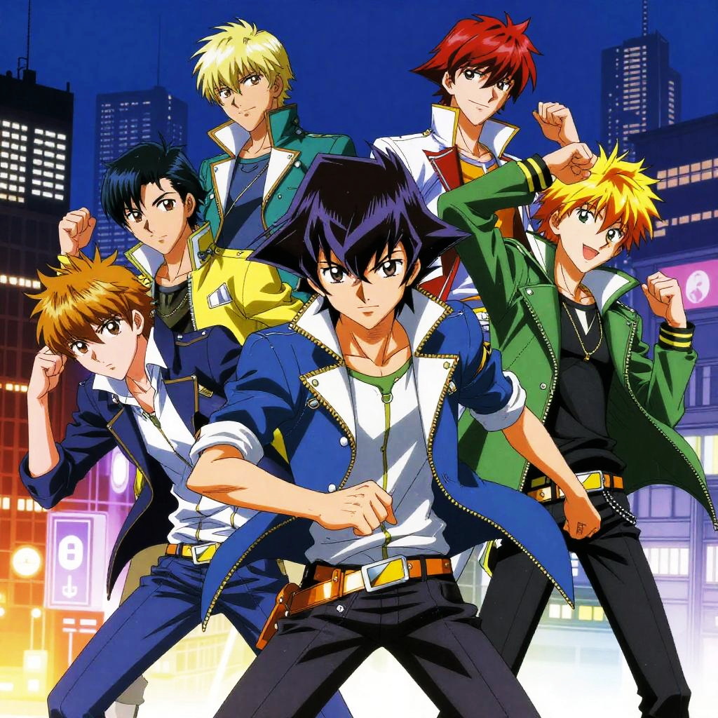 Anime-style drawing of seven male characters with varied hair colors and outfits, posing confidently in a vibrant, neon-lit cityscape at night.