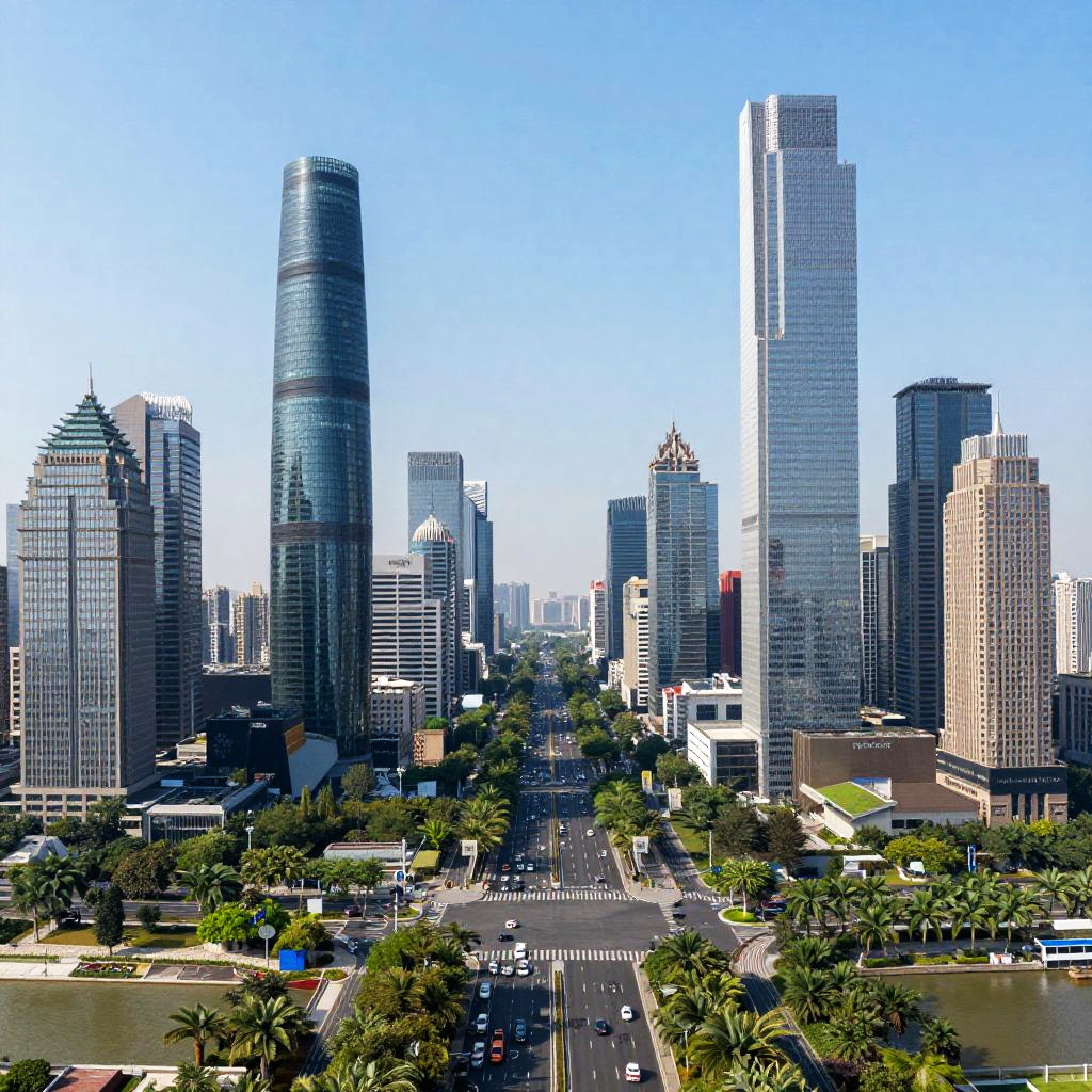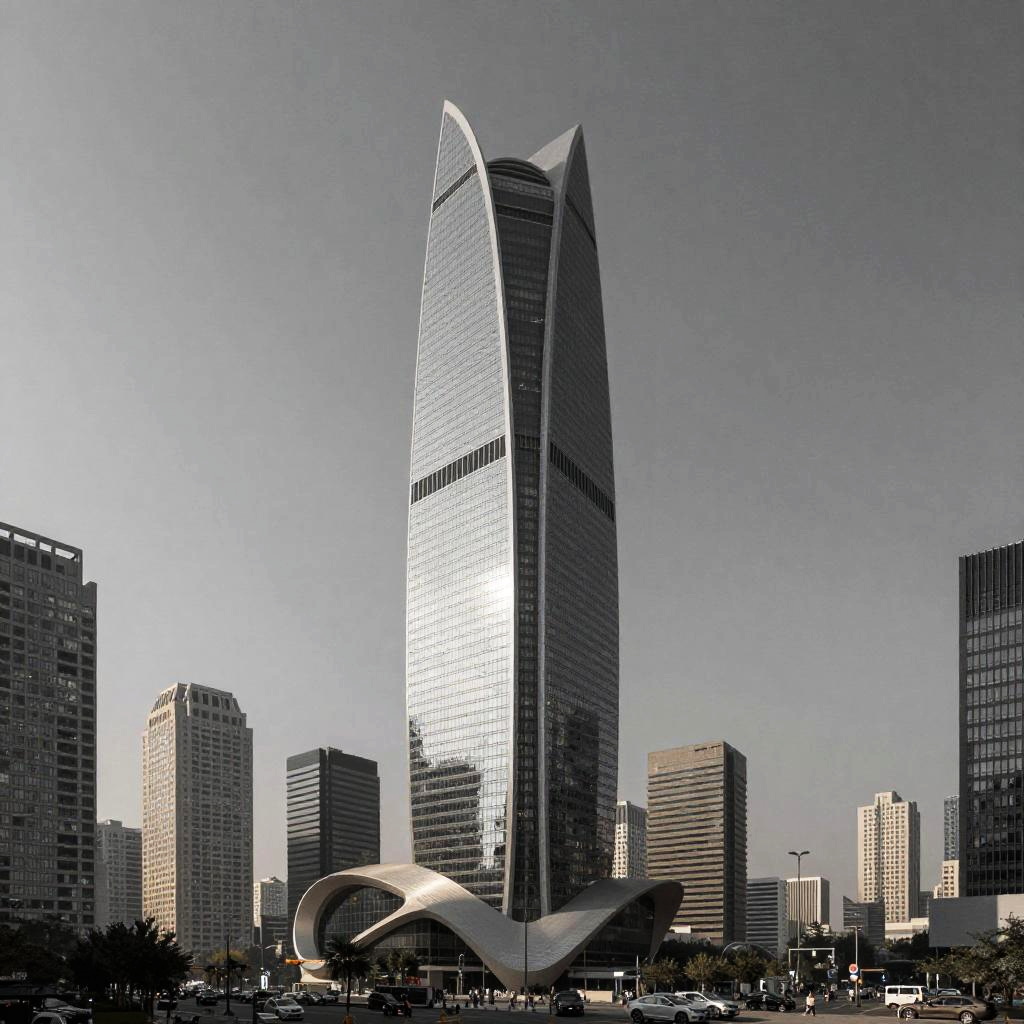 ((Best quality)), ((masterpiece)), ((realistic)), aerial view of modern megacity, skyscraper, magnificent architecture, urban axis, luxuriant plant, clear day, the river, symmetrical picture