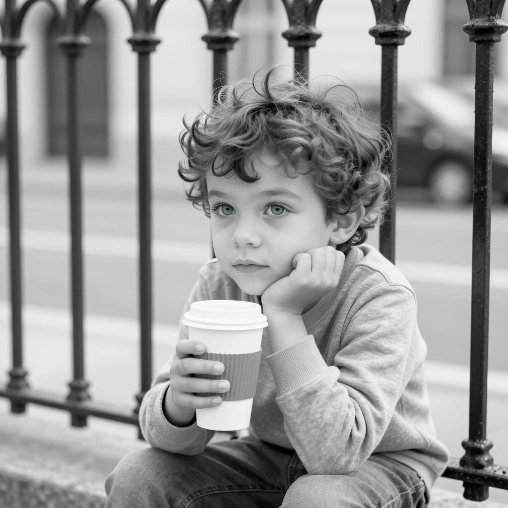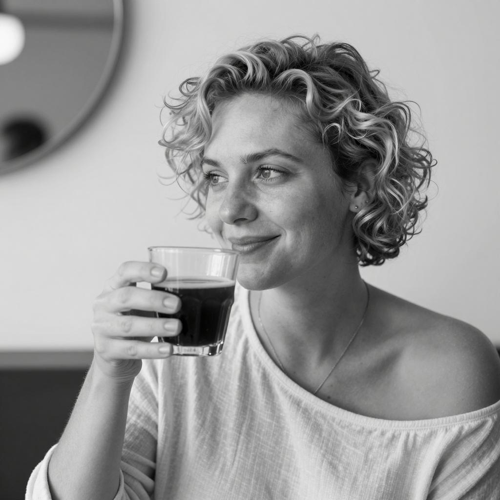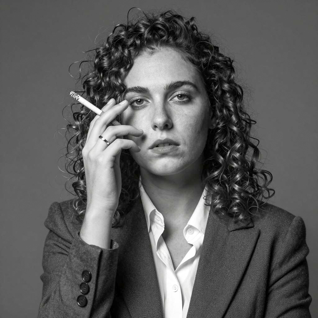 Black and white photograph of a woman with wavy hair in a bun, wearing a short-sleeve shirt and bracelet, sitting at a wooden table. She holds a lit cigarette in her right hand and sips from a floral patterned teacup on a saucer. A ring is on her left hand. The table has a placemat with a folded napkin. A rectangular object is on the right side of the table. The wall behind her has a framed picture.