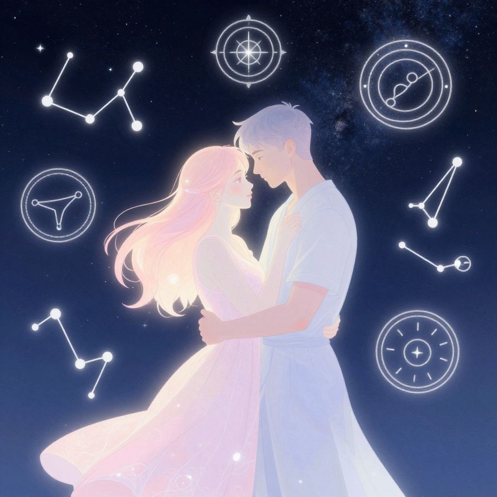 This digital drawing features a silhouetted couple, a man and a woman, standing closely in an intimate embrace against a dark, starry night sky. The woman, with long flowing hair, wears a white dress, while the man, with short hair, dons a white shirt and pants. Both figures are backlit, creating a glowing effect. Surrounding them are white, glowing astrological symbols, including zodiac signs and celestial circles, adding a mystical aura. The background is a deep navy blue, speckled with stars, enhancing the ethereal, romantic atmosphere. The overall style is soft and dreamy, with a focus on the couple's tender connection.