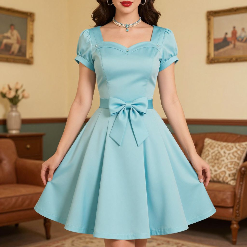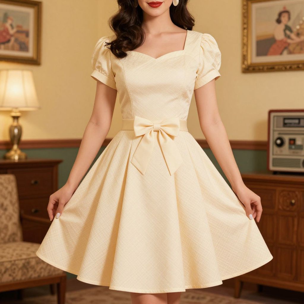 A vintage-inspired digital illustration featuring a woman in a retro 1950s rockabilly swing dress, adorned with a bow at the waist and puff sleeves, set against a cozy interior with warm lighting and classic decor, evoking a nostalgic and stylish aesthetic.