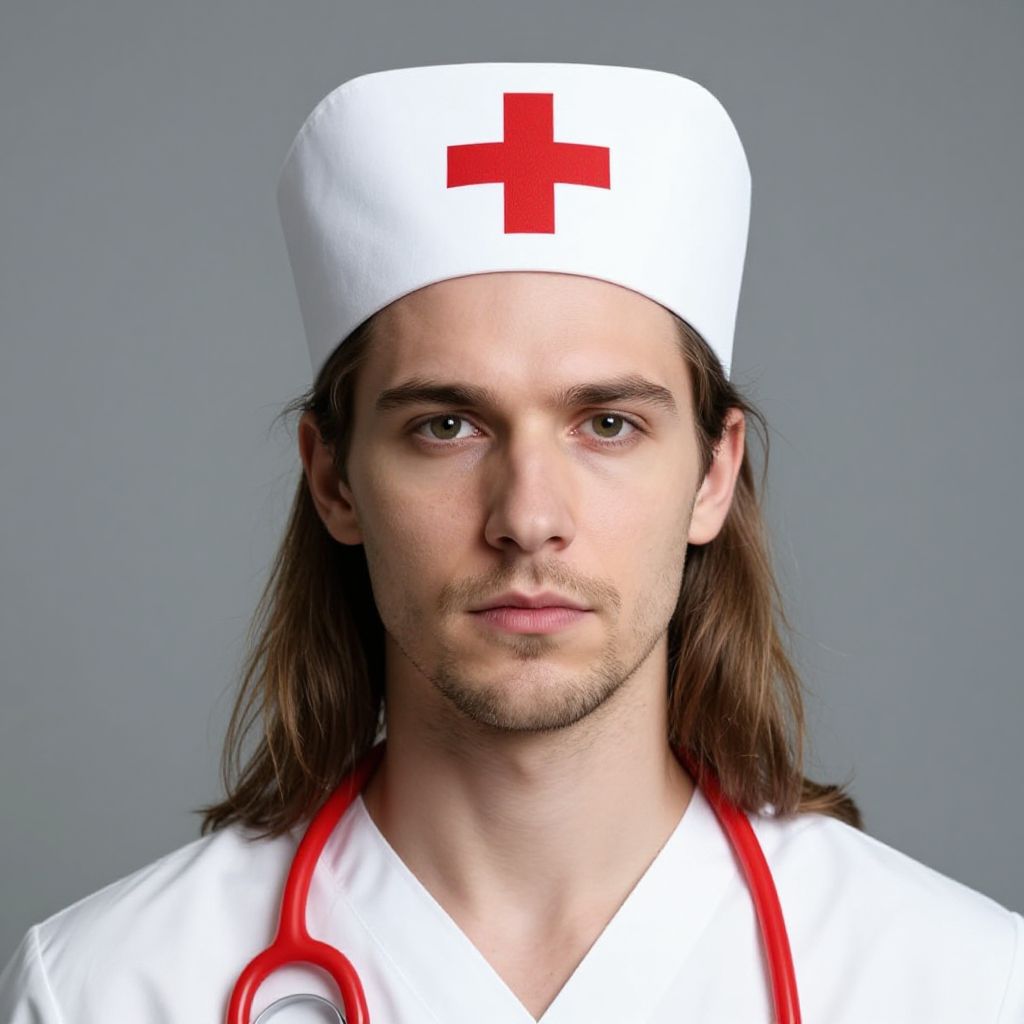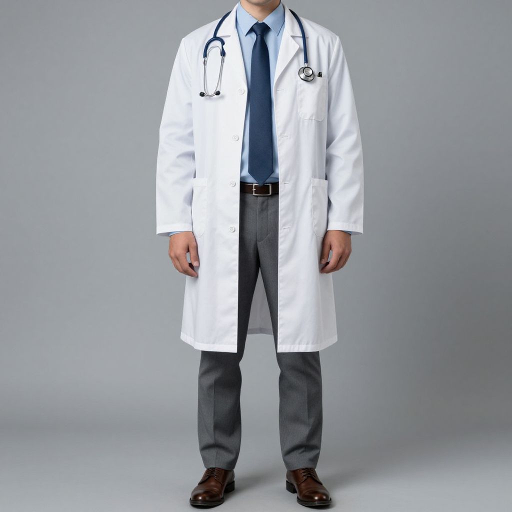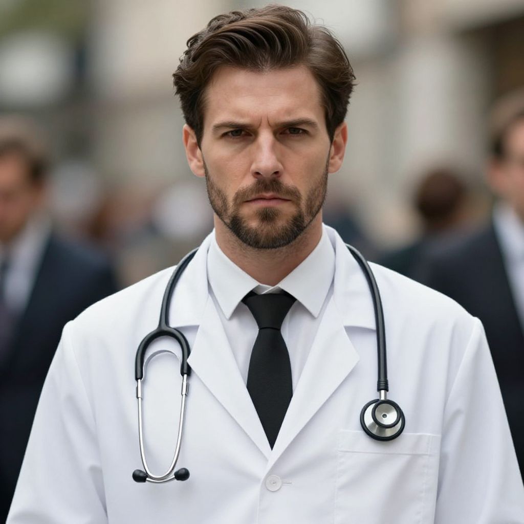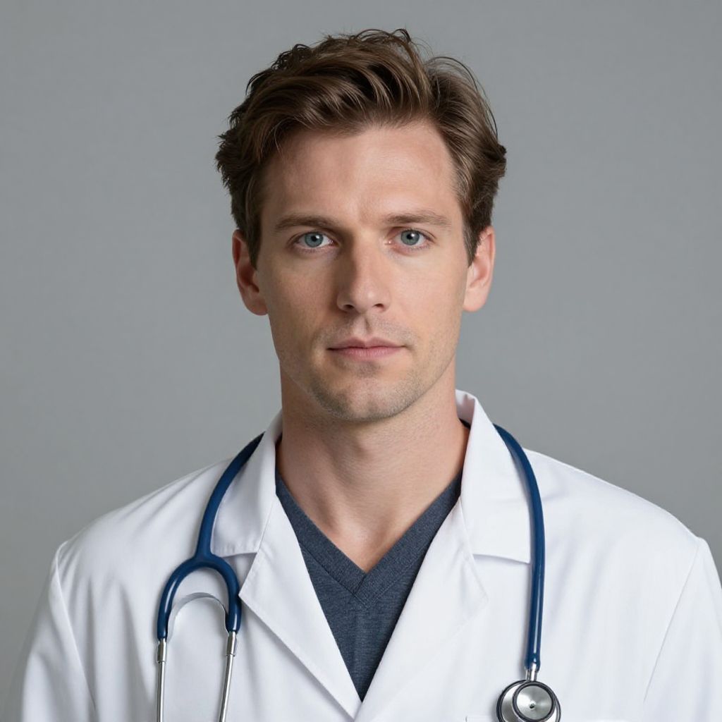 Man with long brown hair and a beard wearing a white lab coat with a stethoscope hanging from the collar.