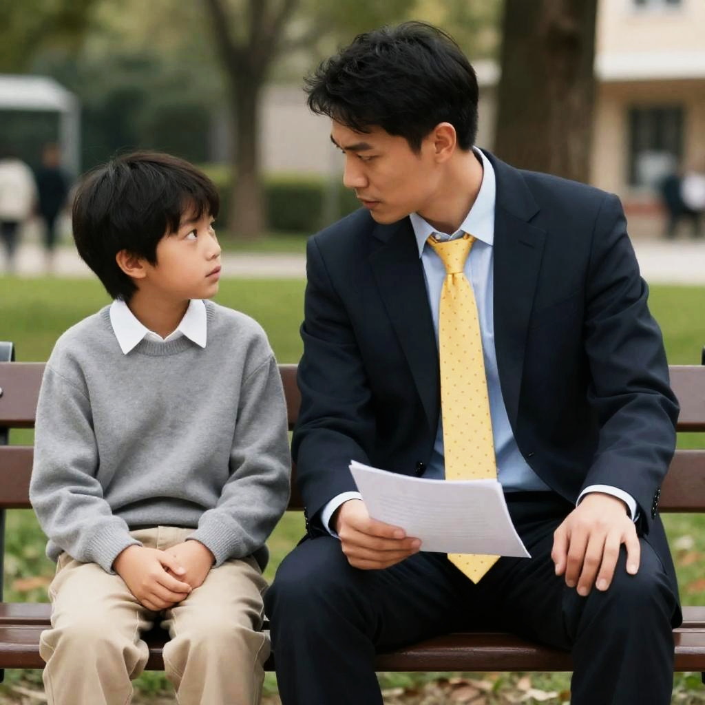 Photograph of a man and a young boy sitting on a bench in a park. Man in dark suit, light blue shirt, yellow polka-dot tie, holding a piece of paper, intense expression. Boy in gray sweater, beige pants, looking at man, hands clasped. Background includes greenery, trees, and a building. Man's right hand on knee, boy's left hand on lap. Daytime, outdoors.