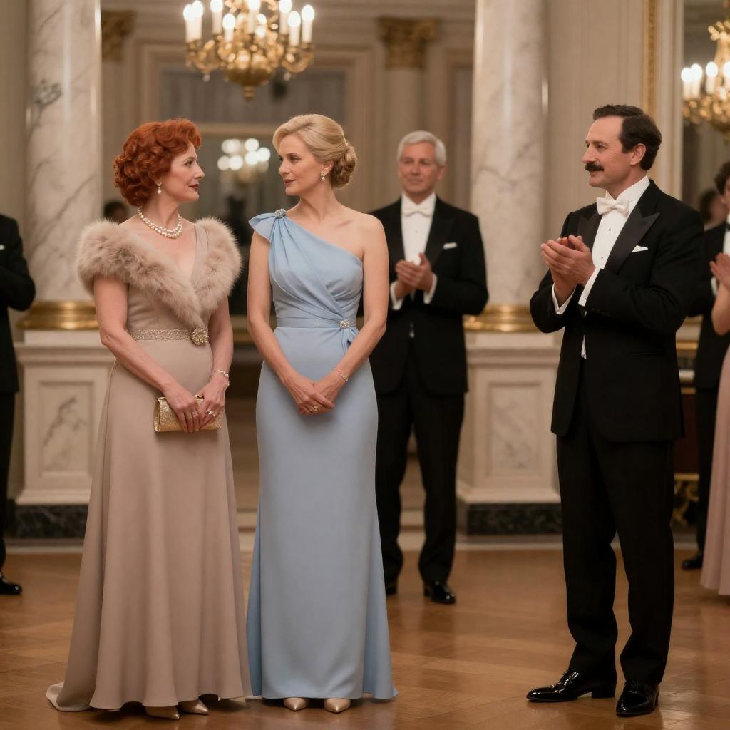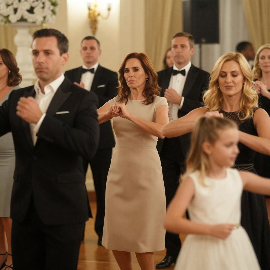 A group of people dancing at a formal event in an elegantly decorated room. The central focus is a middle-aged woman with medium-length brown hair wearing a beige dress, dancing with a focused expression. Surrounding her are men dressed in black tuxedos and white shirts, including one with an open collar. To the right, a blonde woman in a black dress dances with a slight smile. A young blonde girl in a white dress is in the foreground. The background features ornate white floral decorations, warm yellow lighting, and other formally dressed guests.