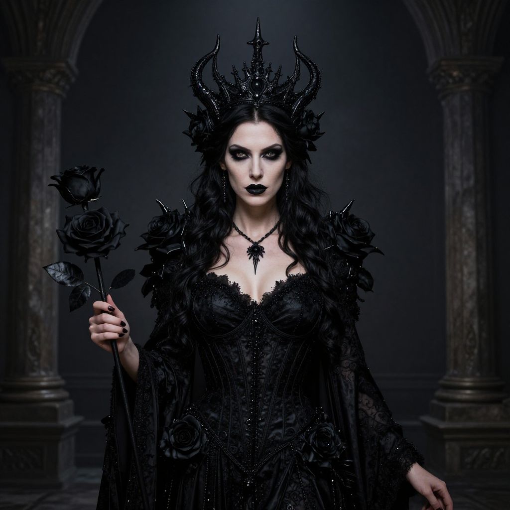 Photograph of a pale-skinned woman with dark, wavy hair wearing an elaborate black crown adorned with spikes. She has dark, smoky eye makeup and black lipstick. Her black, lace dress is decorated with intricate floral patterns and feathered shoulders. She holds a black rose in her right hand. She wears a black star-shaped necklace. The background is dark and gothic, featuring arched pillars. The overall style is gothic and dramatic, with a focus on dark, contrasting colors and textures. The lighting is low, highlighting her face and the black rose.