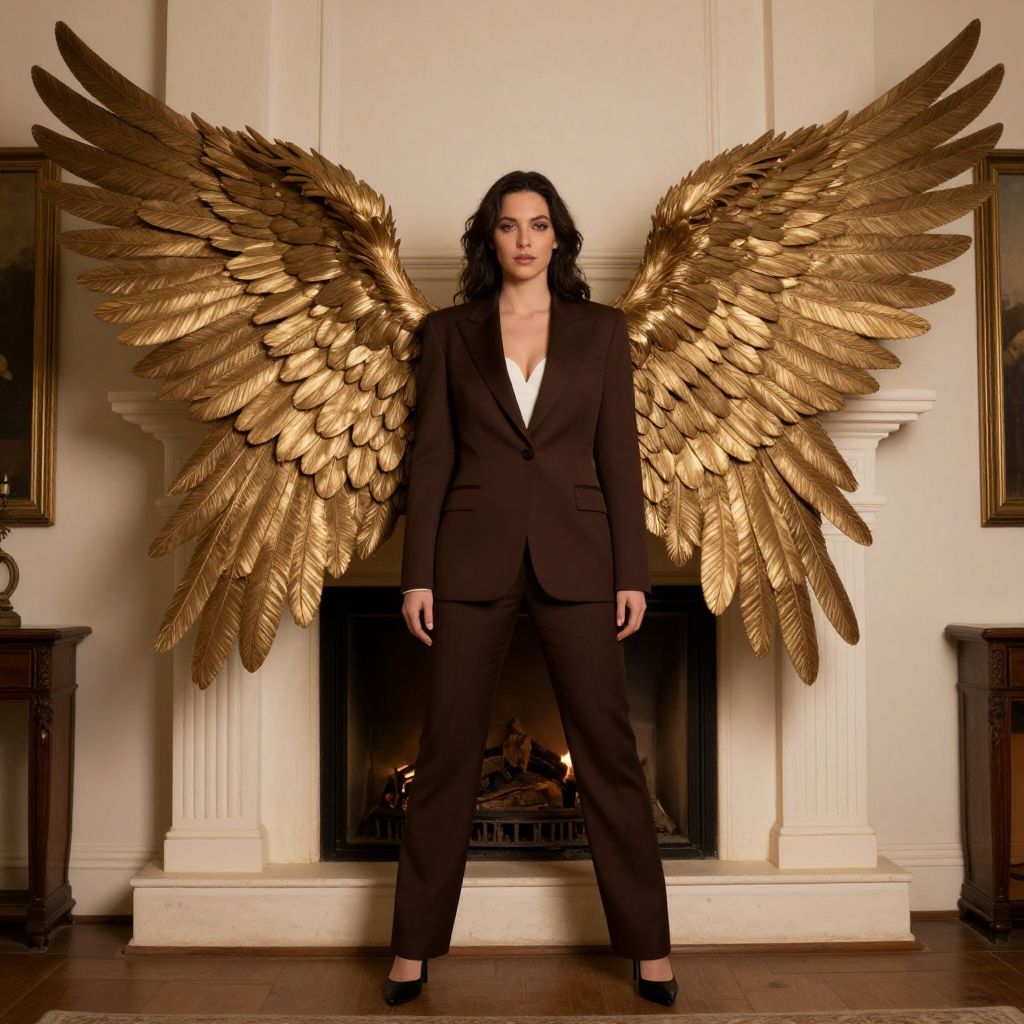 Photograph of a woman with long, wavy dark hair, standing confidently in front of a white fireplace. She wears a black suit with a white shirt, and has large, gold, feathered angel wings attached to her back. Her expression is serious, and she stands with her hands by her sides. The room has wooden floors, and the fireplace is centered with two dark wooden side tables flanking it. The lighting is bright, highlighting the gold wings and her formal attire. The image has a dramatic, superhero-like quality.