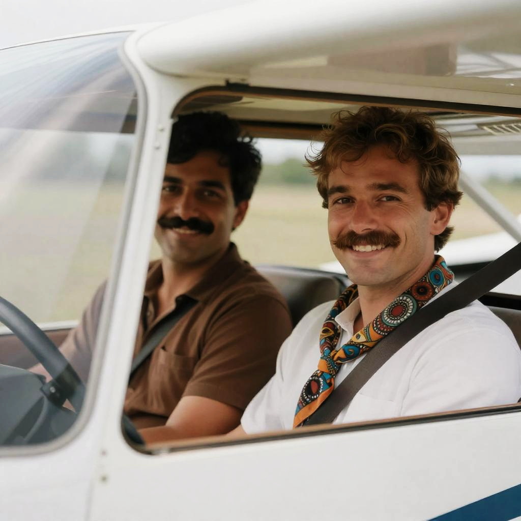 Photograph of two men in a small airplane cockpit. Both have mustaches, with the man on the left having darker hair and the man on the right having lighter, wavy hair. The man on the right wears a white shirt with a colorful, circular patterned scarf. They sit behind the cockpit window, smiling. Background shows blurred greenery. The cockpit has white frames and glass panels. The man on the left wears a brown shirt. Both men are close together, leaning slightly towards the camera.