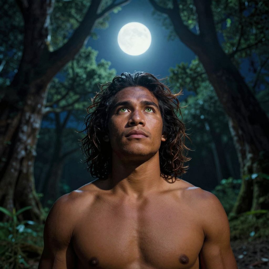 A striking portrait of a young Melanesian man with warm, green eyes and sun-kissed, tousled hair stands in a serene, moonlit forest clearing. His rugged yet refined features are illuminated by an ethereal glow from the luminous orb hovering above his head, casting dramatic shadows across his chiseled jawline and broad shoulders. Captured from a low-angle perspective, this cinematic portrait emphasizes the power and grace of the enigmatic figure, standing in silent contemplation beneath ancient trees with gnarled branches stretching skyward like sentinels guarding the secrets of the night. The tranquil scene masterfully blends nature's serenity with an air of mystique, inviting viewers to delve into his piercing gaze and uncover the hidden stories within his soul.