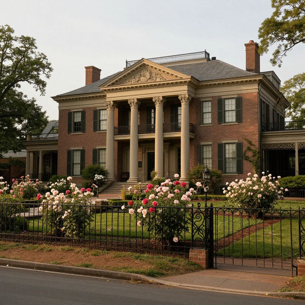 Historic Charlottesville southern mansion exterior, grand columns, manicured gardens with blooming roses, vintage wrought iron fences, warm afternoon light, quiet country road nearby, detailed and realistic architectural style, nostalgic and elegant ambiance