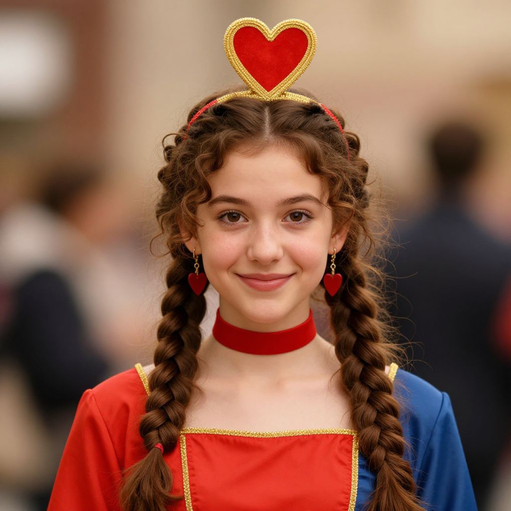 Queen hearts costume youth, 1girl, solo, heart, crown, braid, looking at viewer, blurry background, choker, smile, red choker, blurry, brown hair, jewelry, twin braids, earrings, long sleeves, upper body, curly hair