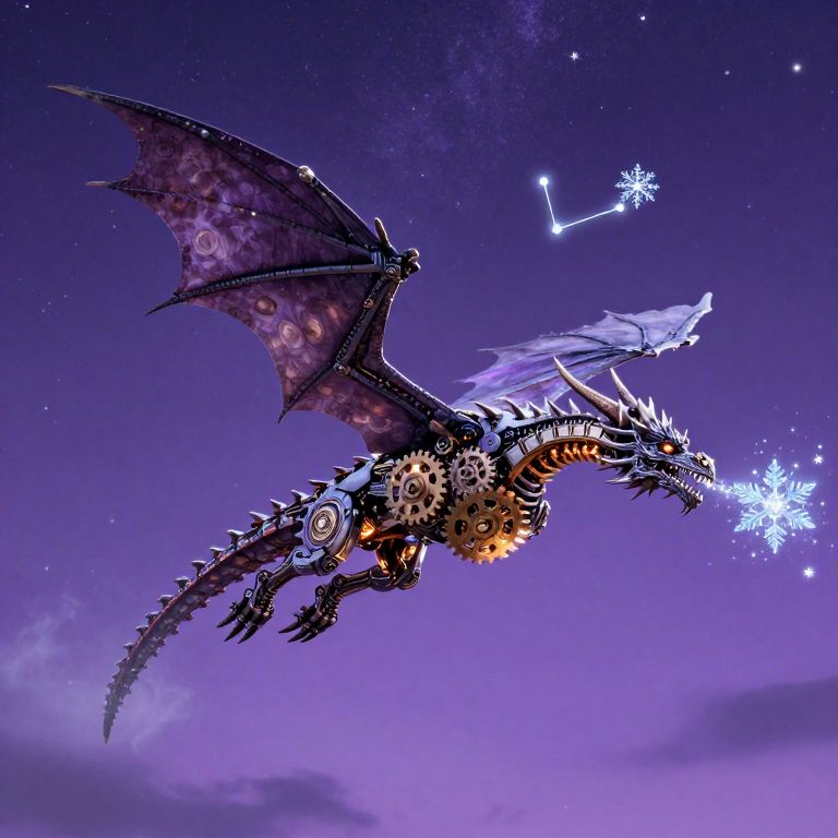 Clockwork dragon soars gracefully through a starlit violet sky, its intricate mechanical body adorned with glowing gears that turn steadily, exhaling shimmering snowflakes that carry twinkling constellations within their crystalline forms.