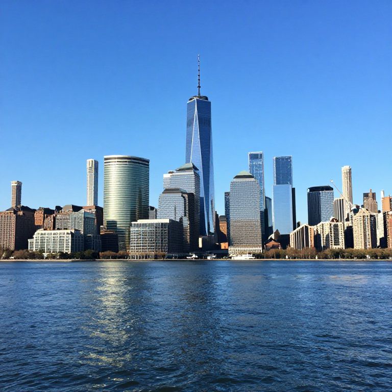 This is a digitally altered photograph of a city skyline viewed from across a body of water. The skyline features a mix of tall skyscrapers with a prominent, tallest building in the center, all under a clear blue sky. The water in the foreground has gentle ripples, reflecting the buildings. The colors are vibrant, with deep blues in the water and sky, and various shades of brown and gray in the buildings.