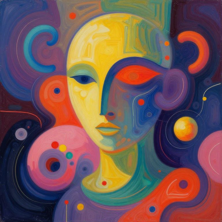 Abstract digital painting of a yellow face with closed eyes, surrounded by vibrant swirls of red, blue, purple, and pink, with colorful dots and