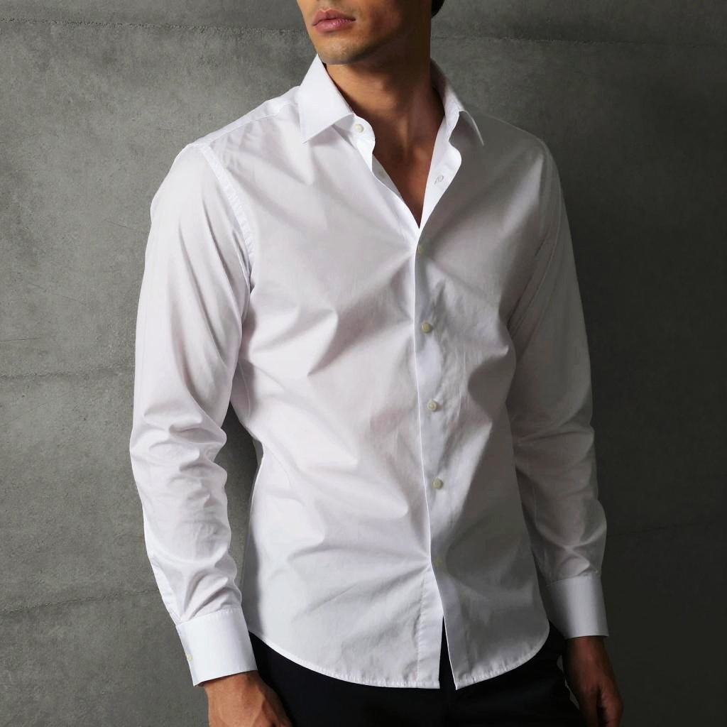 Fashion shoot of a model in a white dress shirt unbuttoned halfway, posing against a minimalist concrete wall, dramatic lighting emphasizing folds and textures, high-contrast style