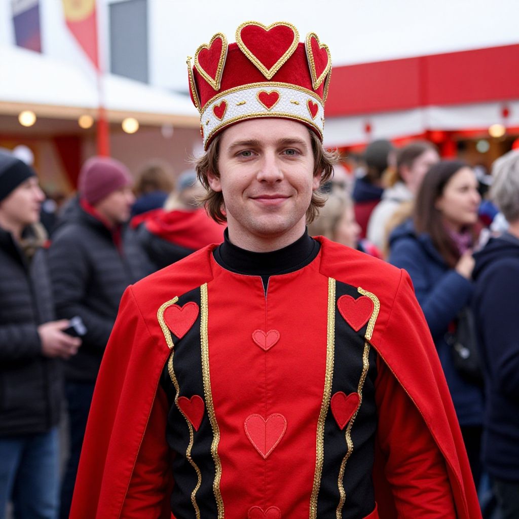 A man dressed as the King of Hearts is captured candidly at a lively festival, wearing a striking red and black costume adorned with heart symbols and gold trim. His detailed outfit includes a large, royal crown with heart motifs and a matching red cape, creating a vivid cosplay portrait amidst the crowd.