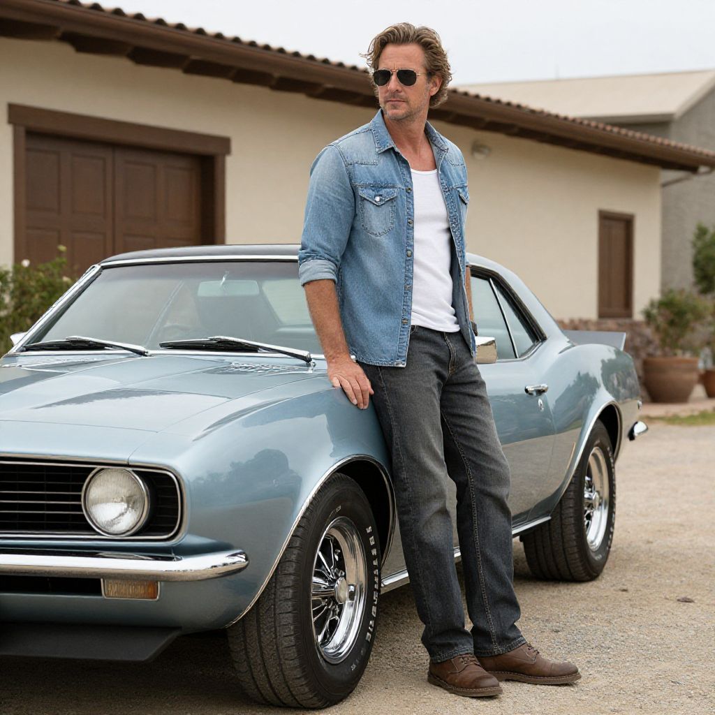 Photograph of a tall, fit man with light brown, wavy hair and light skin, wearing dark sunglasses, a light blue denim jacket over a white t-shirt, dark blue jeans, and brown shoes. He leans against a shiny, light blue classic muscle car with black rims, parked in a gravel driveway in front of a beige stucco house with brown wooden doors and terracotta pots. The car's chrome accents and circular headlights are prominent, and the background includes a tiled roof and a partially visible window. The man's relaxed posture and confident expression suggest a cool, laid-back vibe.