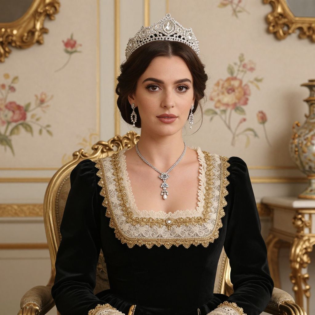 Elegantly seated in a regal chair, a woman adorned in a luxurious black gown with gold embellishments and a cream lace collar, accessorized with a sparkling tiara, dangling earrings, and a detailed necklace, exudes an air of aristocratic sophistication against a backdrop of floral wallpaper and ornate decor.