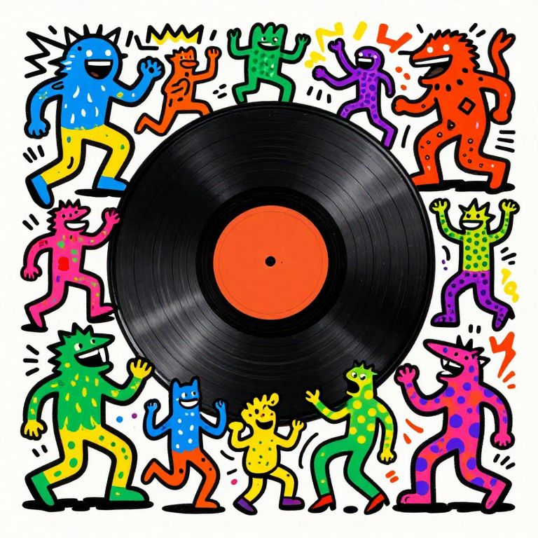 Craft an image in a bold, dynamic style reminiscent of Keith Haring's work, portraying a lively scene where various cartoonish, anthropomorphic creatures frolic merrily around a prominently displayed oversized vinyl record. These creatures showcase a range of vivid colors and distinctive patterns that meld seamlessly into the spirited composition. Accentuate their exaggerated forms with clear outlines and fluid movements to convey an emotional spectrum from lighthearted gaiety to exuberant jubilation as they participate in lively interactions beneath vibrant, graffiti-inspired backgrounds. This captivating scene radiates a sense of unity and harmony through its vivid hues and rhythmic dance party atmosphere.
