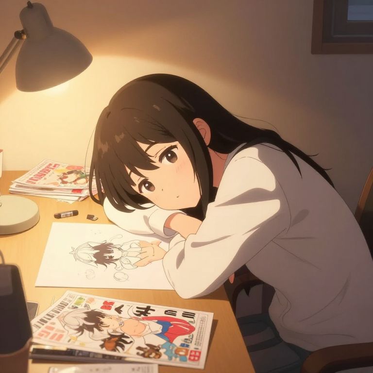 Anime girl leaning over her desk in a cozy bedroom, scattered manga and art supplies, warm lighting from a desk lamp, expressive face with tired yet hopeful eyes, soft color palette