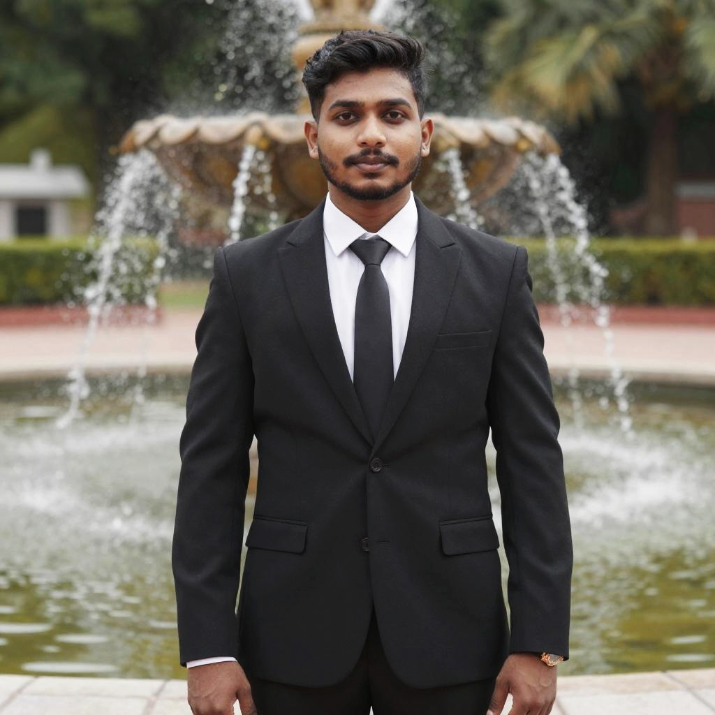 Portrait of a young South Asian man wearing a black suit with a white shirt and black tie, standing in front of a water fountain in an outdoor setting. The man has short, styled black hair and a small white traditional mark on his forehead, suggesting cultural significance.