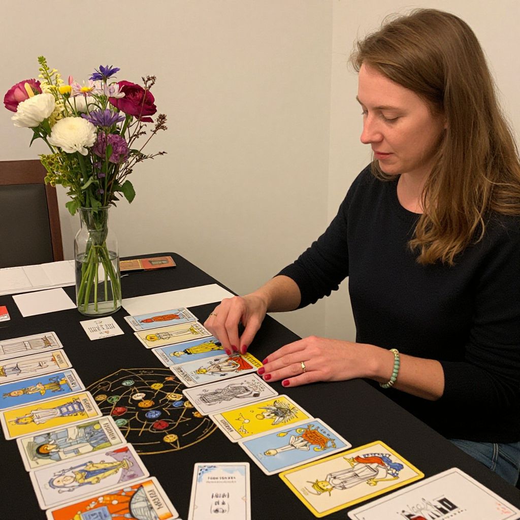 Woman engaging in a tarot card session, seated at a table adorned with colorful cards and a vase of fresh flowers, during the Tarot Retreat with Donna Wignall from 27th to 29th March 2020.