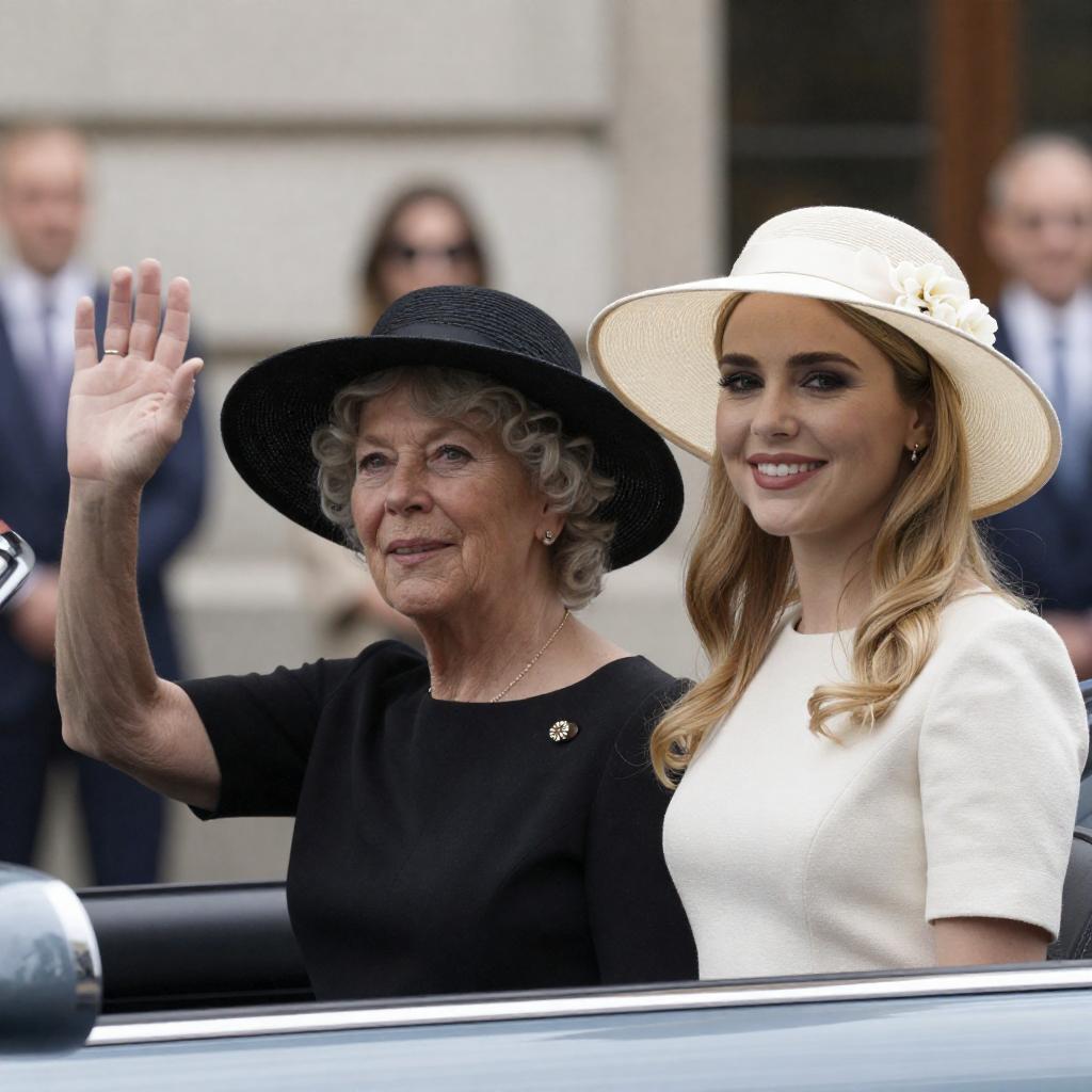 Photograph of a horse-drawn carriage. Brown horse, black harness, six passengers. Three men in military uniforms with red and gold accents, two men in dark suits, one woman in white dress. Carriage has large spoked wheels. Gray stone building with columns in background. Three men standing near entrance, one in brown coat, others in dark suits. Horse walking to the right. Bright daylight.