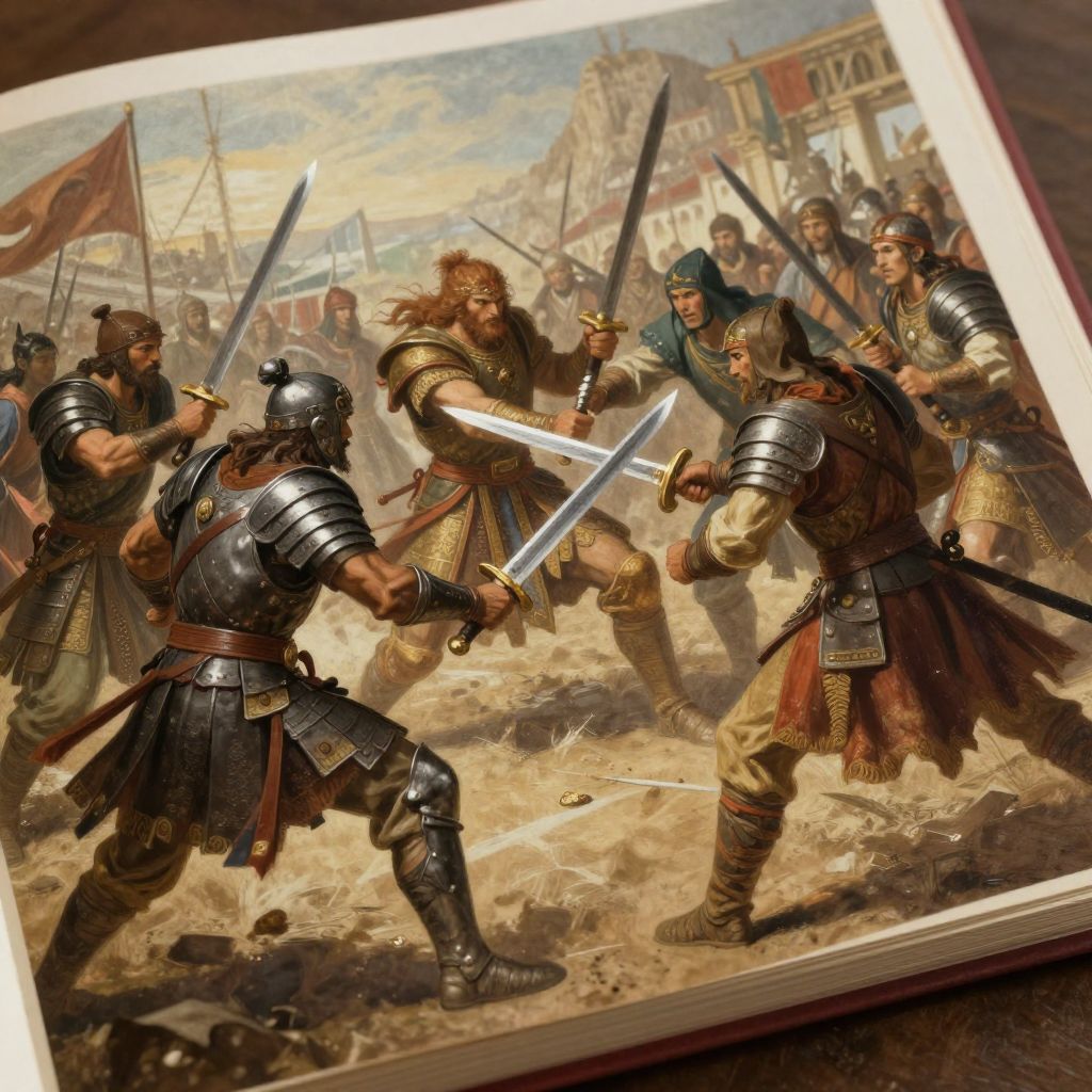 Oil painting of five bearded men in medieval armor, red turbans, holding swords, standing in front of a desert mosque.