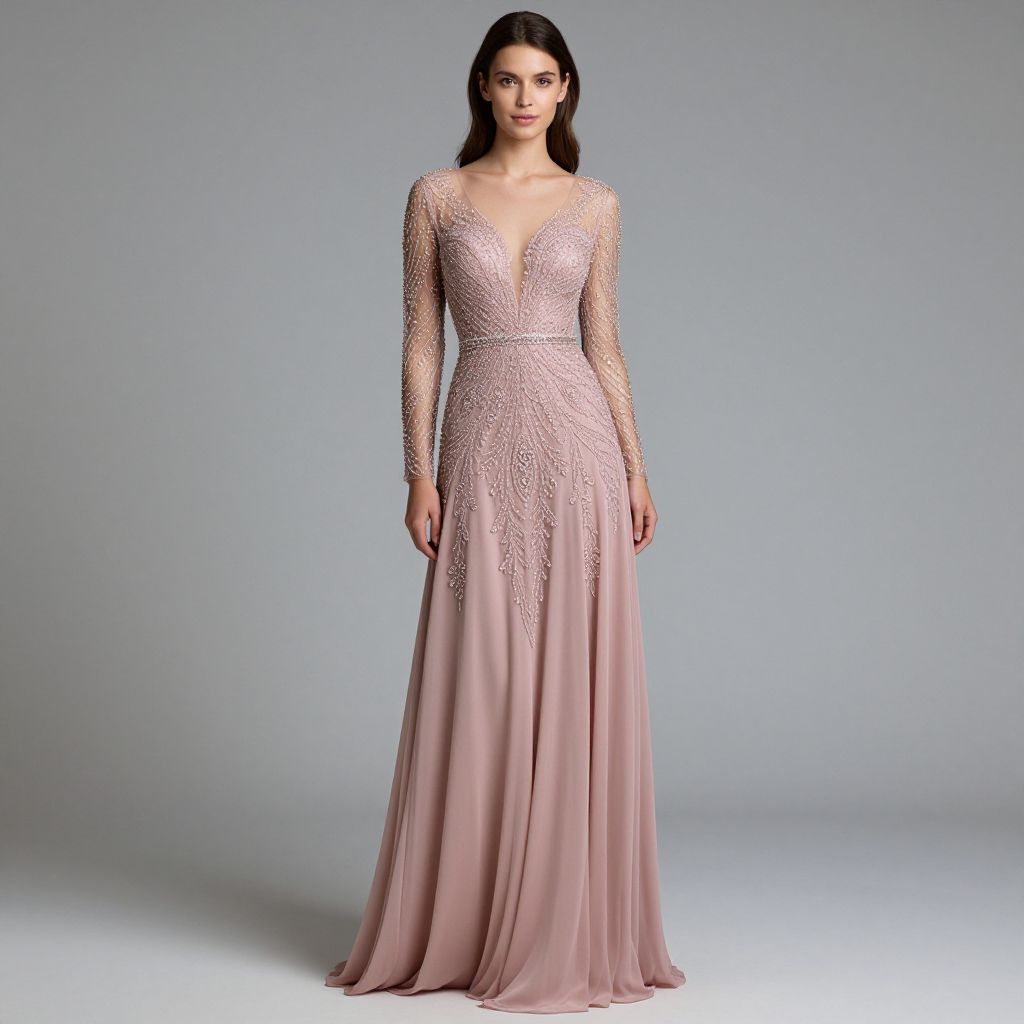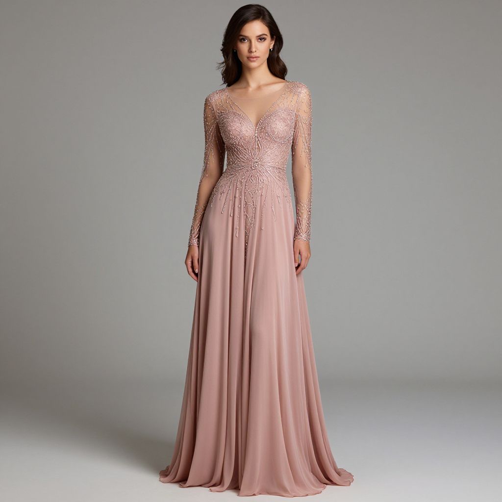 Elegant woman modeling a long-sleeve, heavily beaded, dusty pink evening prom dress by Dorodut, featuring sheer lace detailing and flowing chiffon fabric, ideal for formal events and parties.