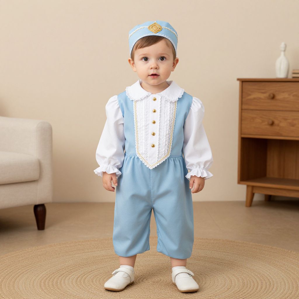 Photorealistic digital illustration of a young boy standing in a brightly lit room. The boy has light skin, brown eyes, and short brown hair. He wears a light blue cap with a yellow emblem, a white long-sleeve shirt with ruffled cuffs and a decorative front, and light blue overalls. He also wears white, lace-up shoes. The background includes a beige armchair on the left, a wooden side table with a small white object on top, and a circular beige rug on the floor. The room has cream-colored walls. The boy's expression is neutral, and he stands with his hands by his sides.