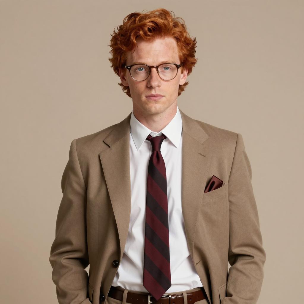 Halloween costume, photorealistic, male, young man, medium build, brown hair, strong jawline, serious expression, standing in narrow alley, autumn evening, dark brown long-sleeve shirt, orange-brown suspenders, brown belt, hands relaxed by sides, warm yellow street lights in background, blurred brick buildings, fallen leaves on ground, natural light, slightly cool color palette, realistic ure, detailed clothing, realistic shadows, mysterious atmosphere, cinematic style, movie still vibe