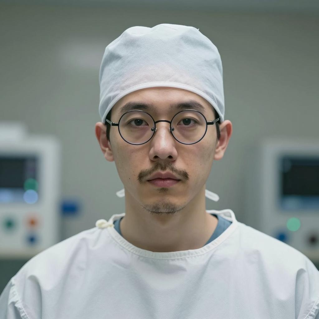 Male surgeon with pale skin, mustache, and thin lips. Wearing a white surgical cap, round glasses, and white surgical gown. Background is dimly lit with medical equipment. Close-up, centered. Single person. Intense expression. Soft lighting.