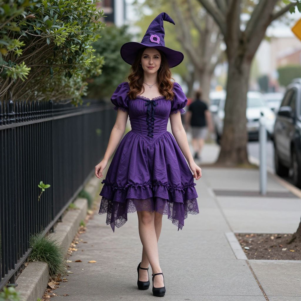 Purple Witch Costume, woman in a purple dress and hat standing on a sidewalk