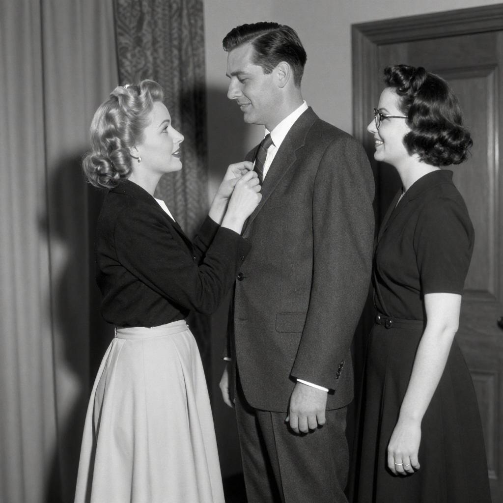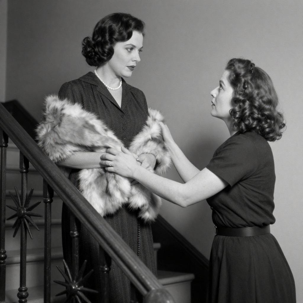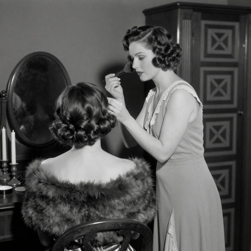 Black-and-white photograph of a 1920s-style scene. A woman with short, wavy hair and a sleeveless dress with lace trim stands holding a brush, applying makeup to another woman seated at a vanity table. The seated woman has her back to the camera, wearing a fur stole. The vanity has an oval mirror, candles, and makeup items. Dark wooden cabinets with geometric patterns are in the background.
