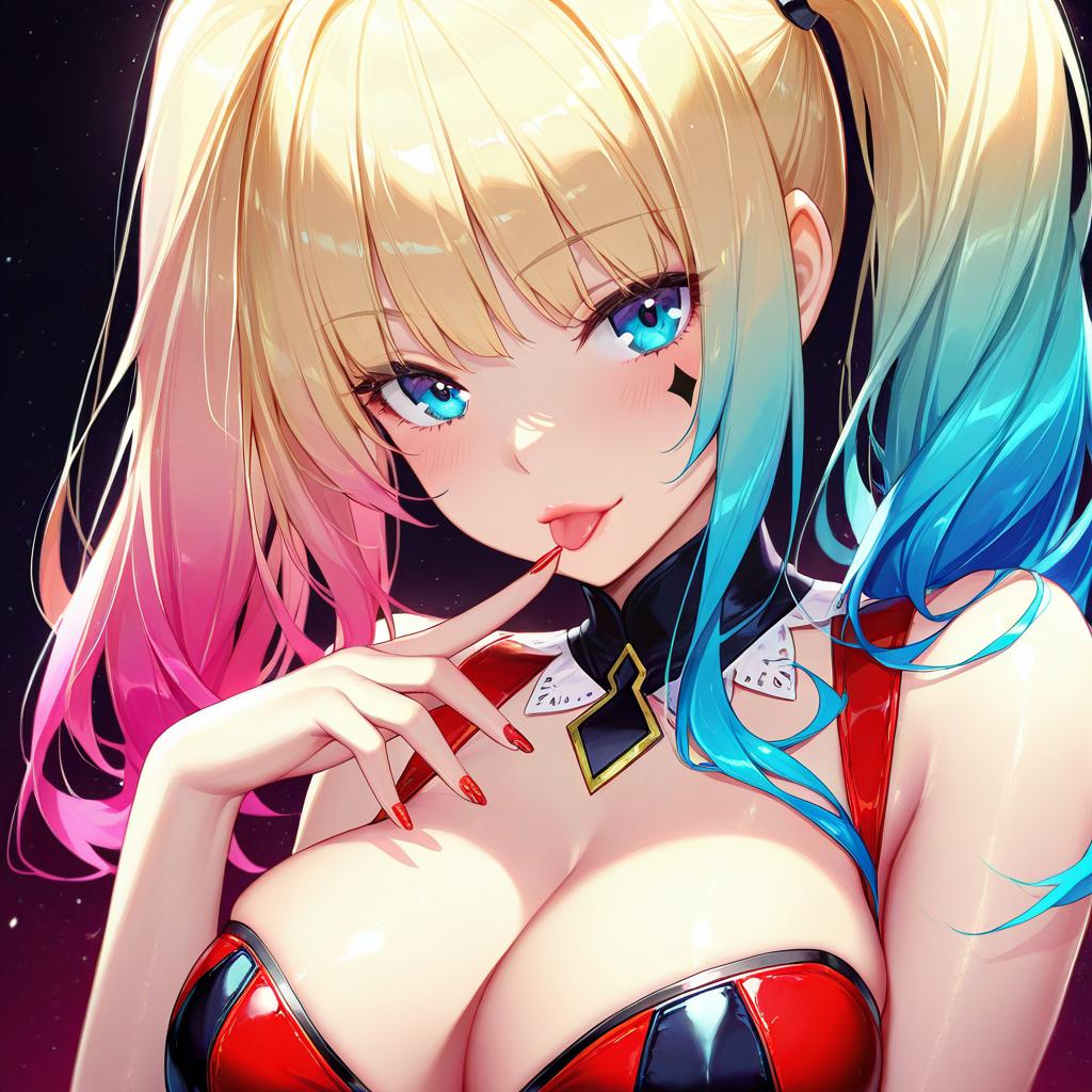 Harime nui, kill la kill, 1girl, blue eyes, eyepatch, blonde hair, big hair, long hair, twintails, hair bow, strapless dress, pink footwear, boots, pink dress, pink bow, huge bow, earrings, twin drills, wrist cuffs, heart, by artist naidong (artist), dark_illustrious