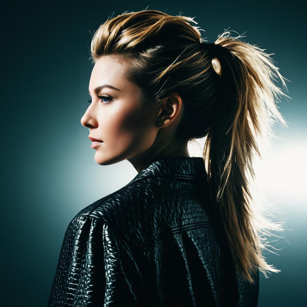 Profile portrait of a blonde woman with a textured mullet hairstyle tied in a high ponytail. She is wearing a stylish black leather jacket and is set against a dark background with dramatic backlighting, captured in a fashion editorial style.
