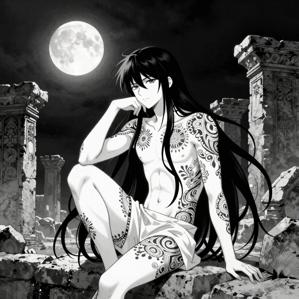 Black and white hair anime character with a mysterious aura, seated on ancient stone ruins under a full moon, intricate tattoo patterns visible on exposed skin, ethereal glow, delicate manga style with fine line details and high contrast monochrome background.